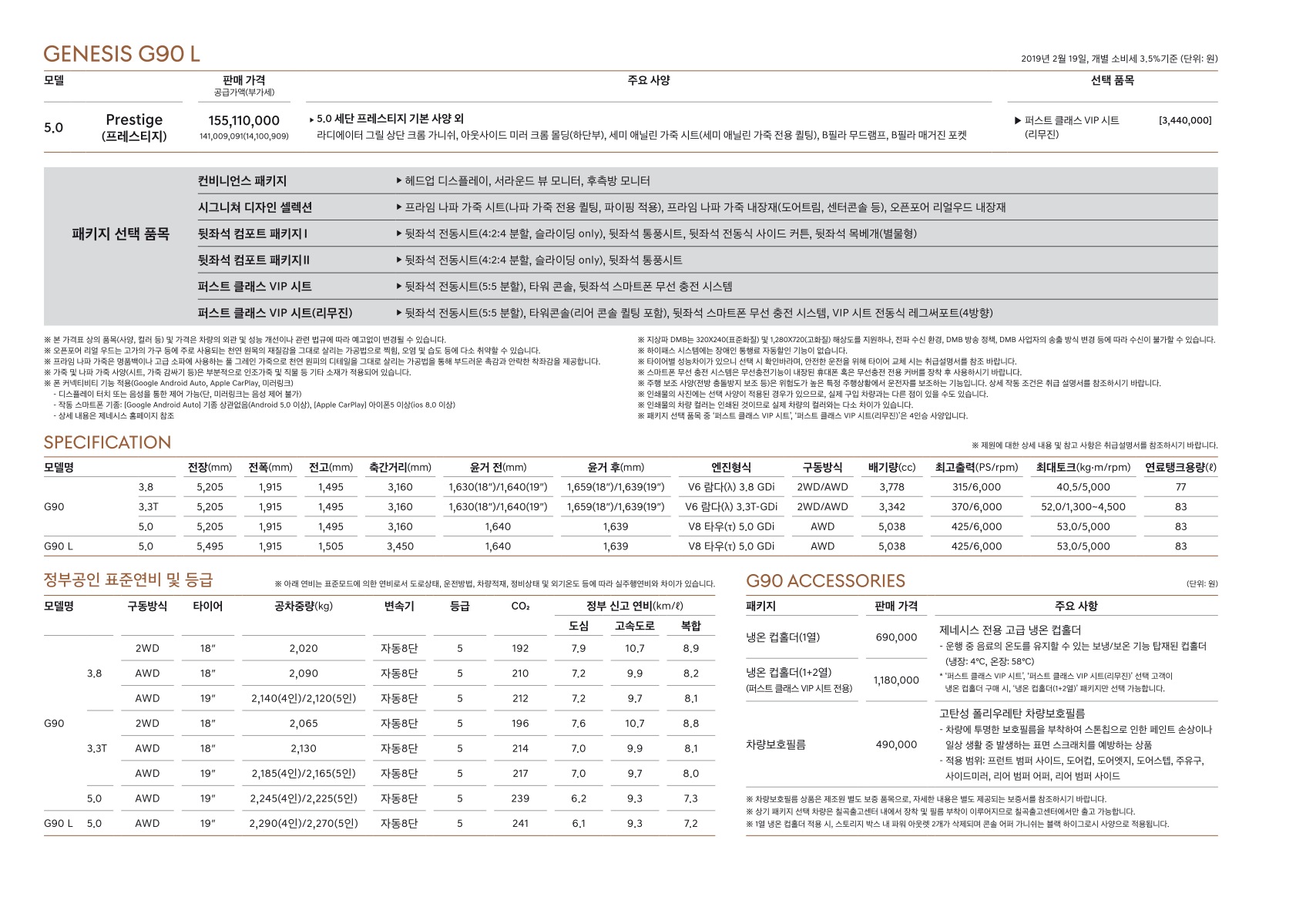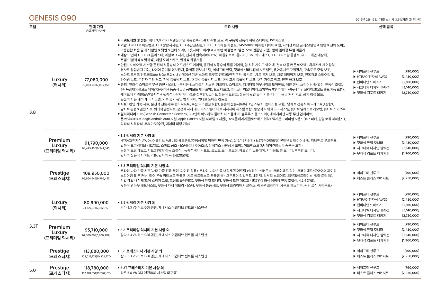 2019년 2월 제네시스 G90 신차가격표 (G90L 리무진 출시)