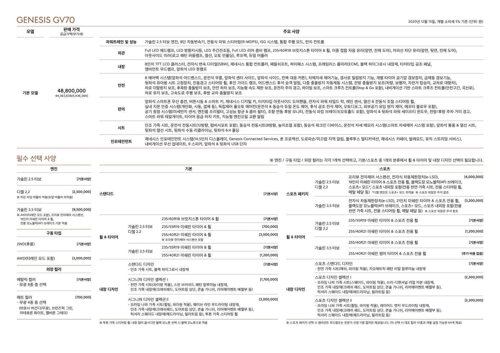 2020년 12월 GV70 신차가격표 (개별소비세 인하분 반영)