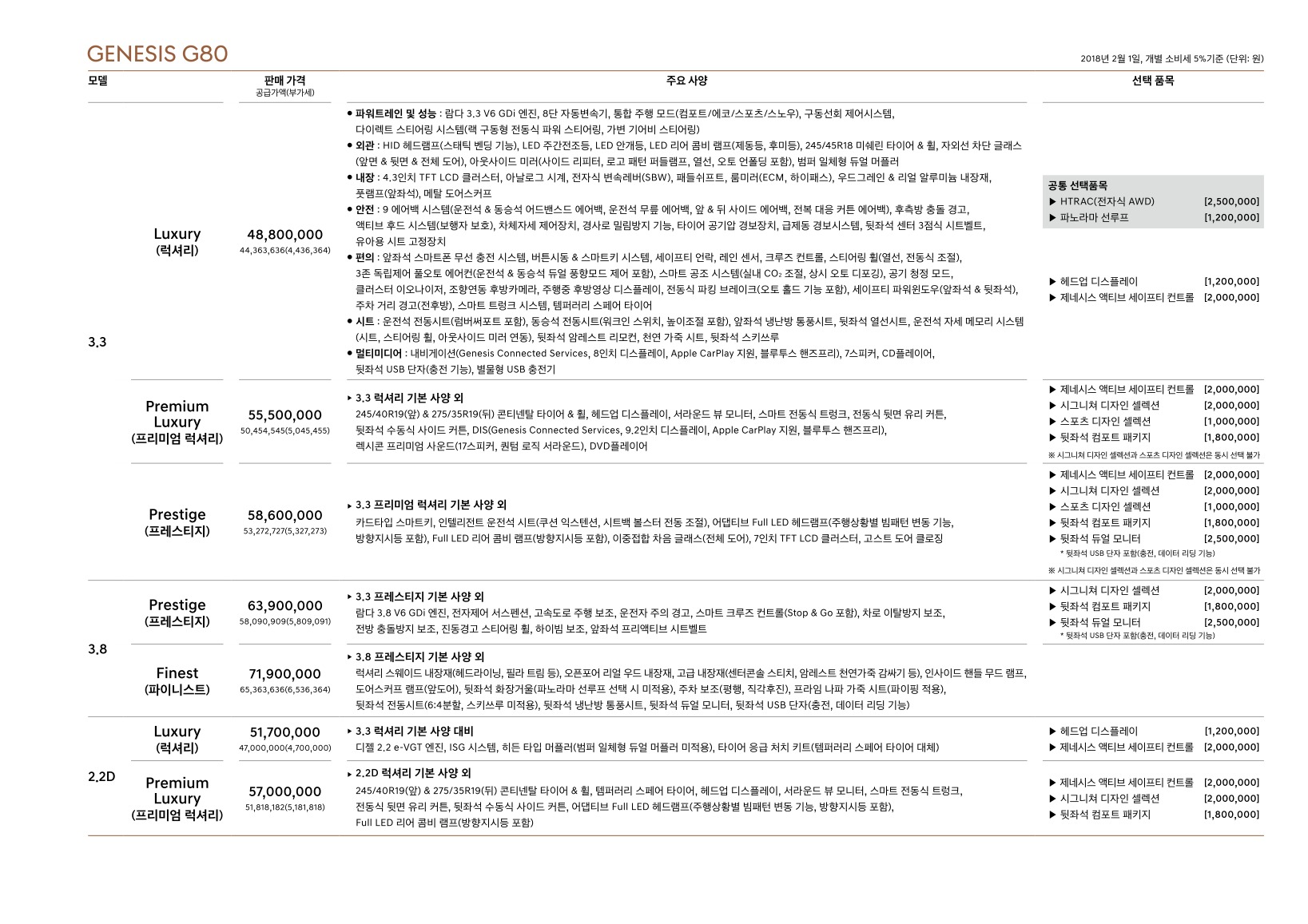 2018년 1월 제네시스 G80 신차가격표 (2.2 디젤 출시)