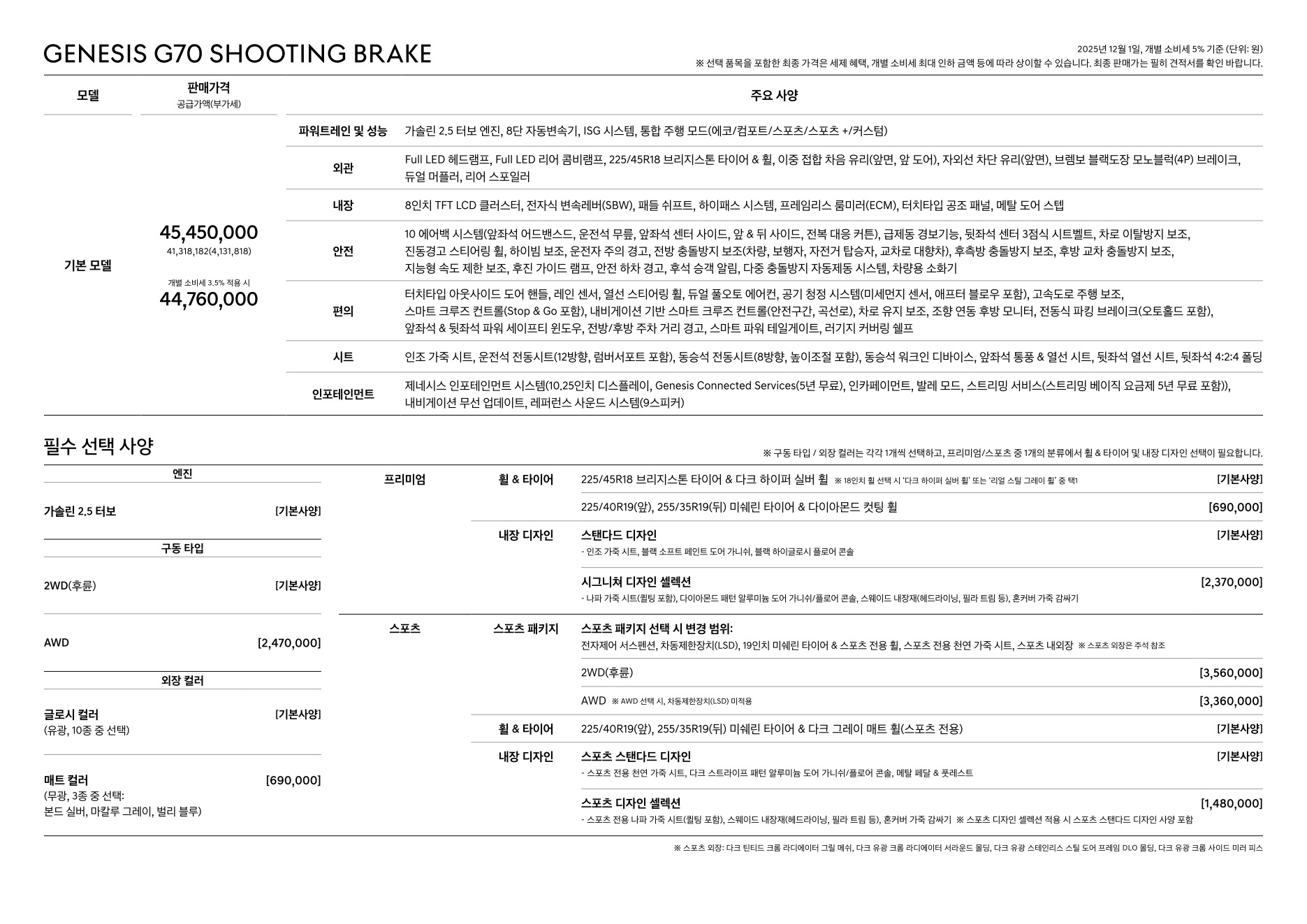 2025년 12월 G70 슈팅브레이크 신차가격표