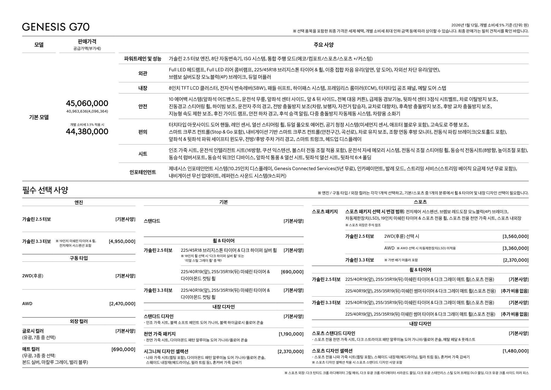 2026년 1월 G70 신차가격표 (2026년형 G70 출시)