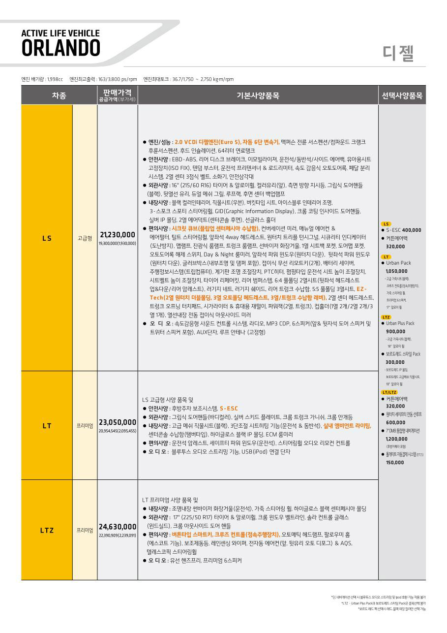 2011년 7월 올란도 신차가격표 (LPG 출시)
