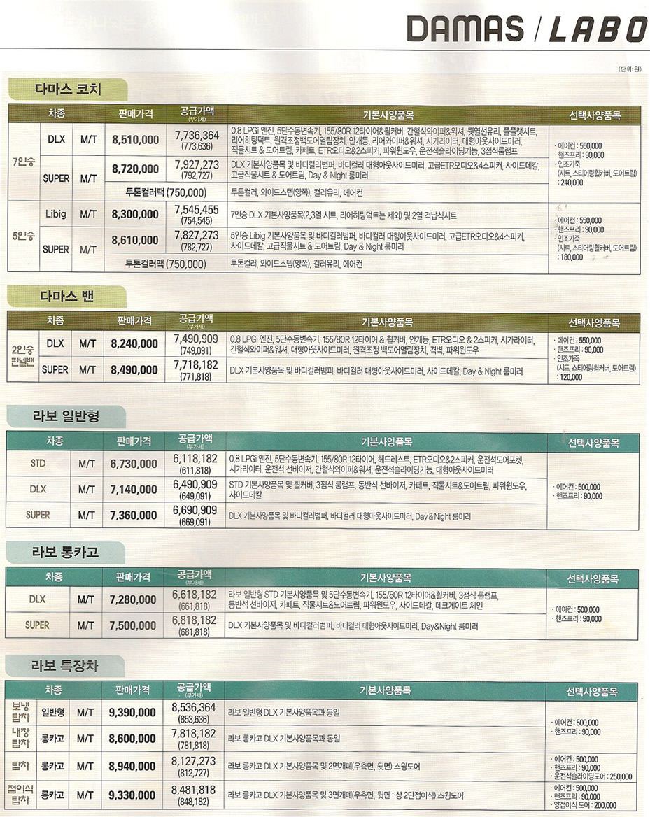 2009년 2월 뉴 다마스 & 뉴 라보 신차가격표