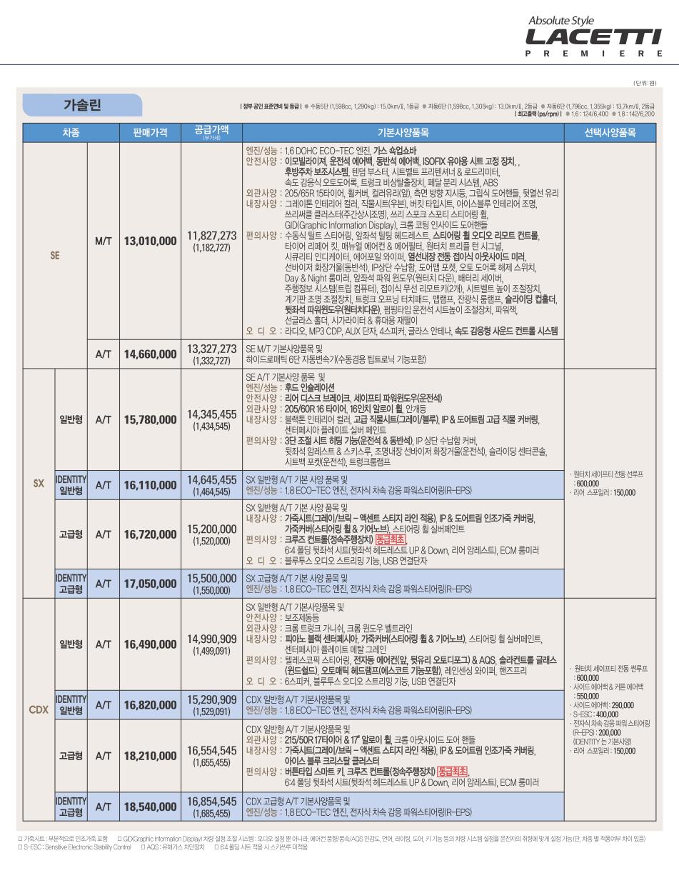 2010년 11월 라세티 프리미어 디젤 신차가격표