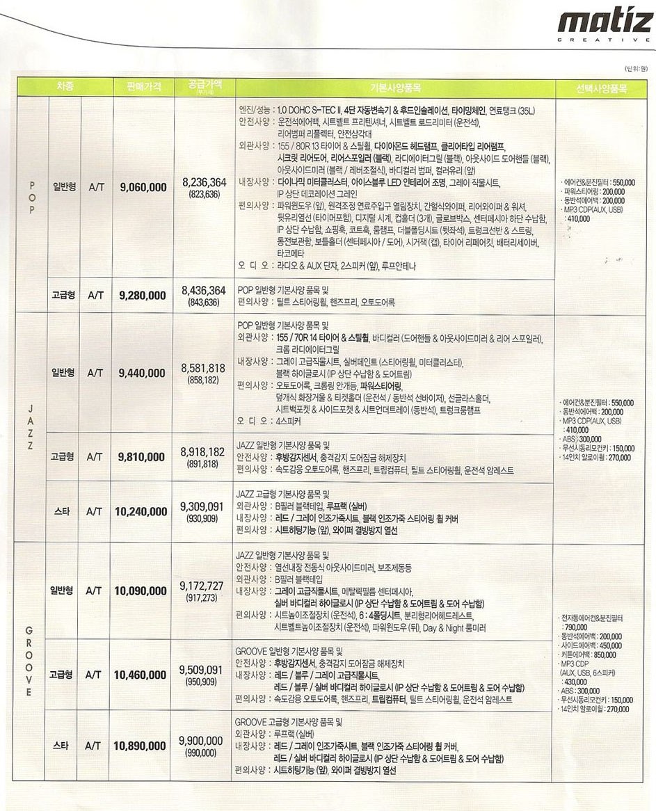 2010년 3월 마티즈 크리에이티브 신차가격표