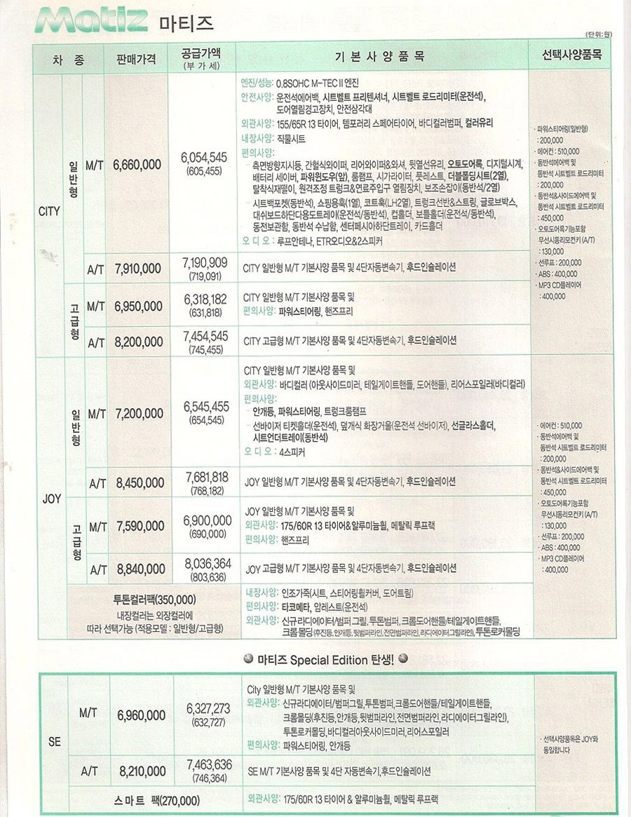 2005년 11월 올뉴마티즈 신차가격표