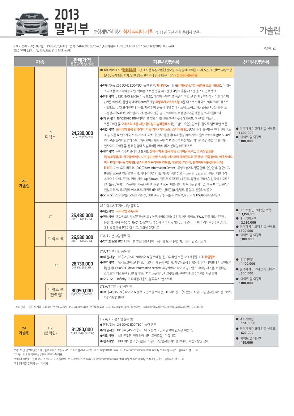 2013년 1월 말리부 신차가격표