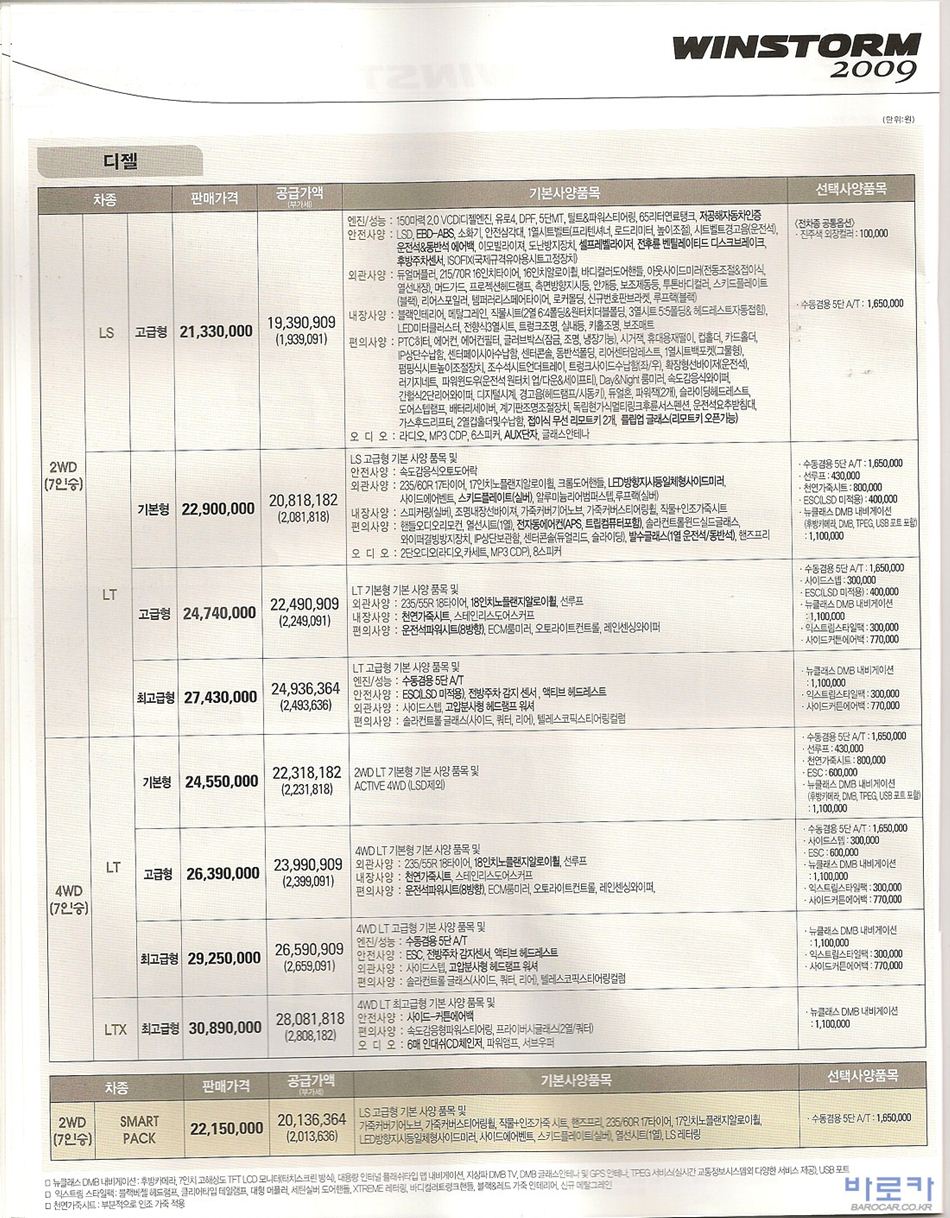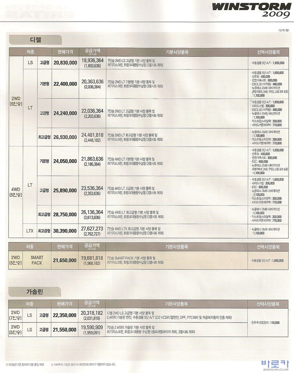 2009년 9월 윈스톰 신차가격표