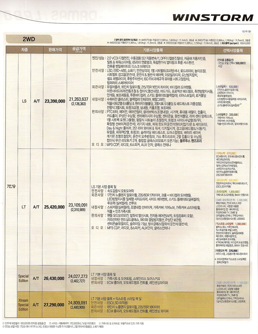 2010년 3월 윈스톰 신차가격표