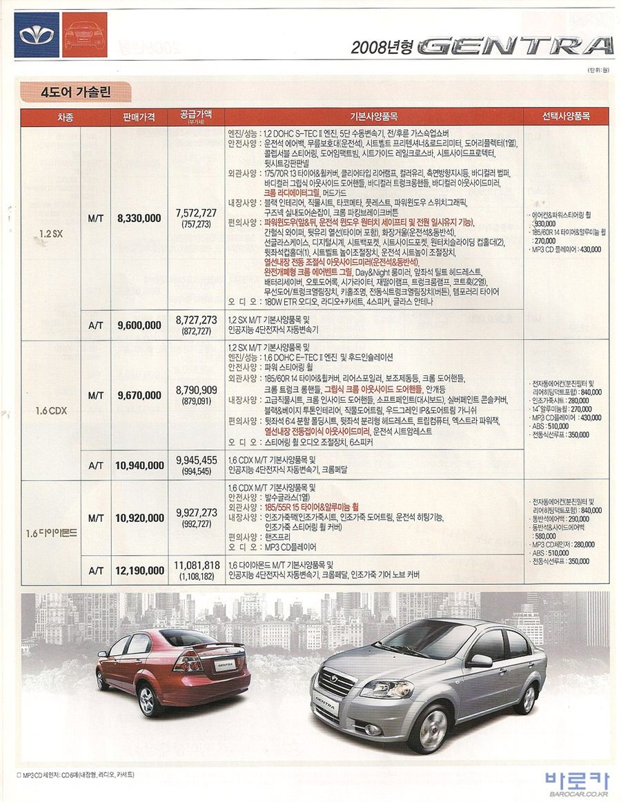 2008년 5월 젠트라 신차가격표 (2009년형)