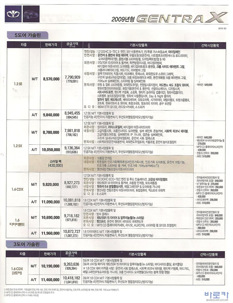 2008년 5월 젠트라 신차가격표 (2009년형)