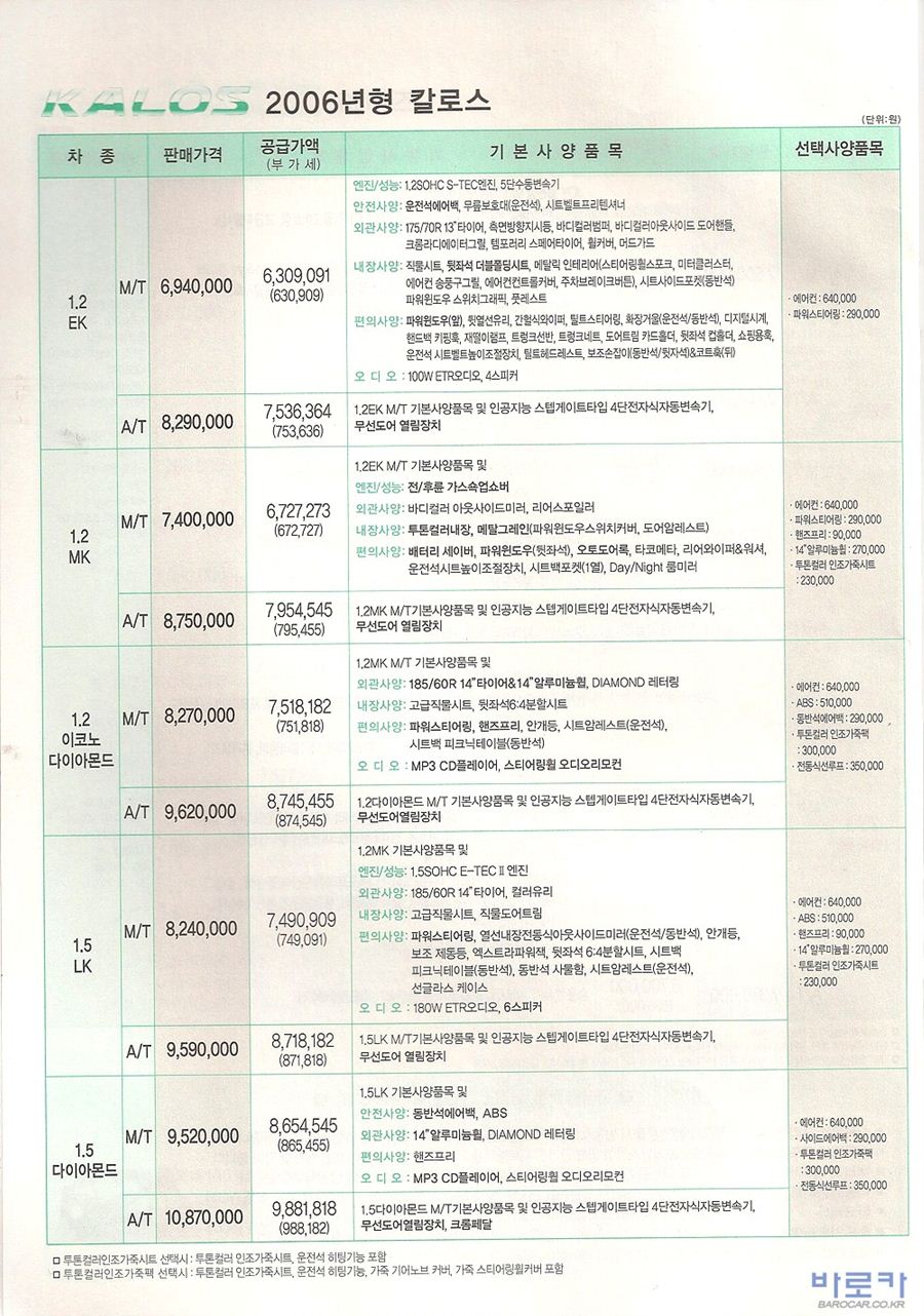 2006년 8월 칼로스 신차가격표 (2007년형)