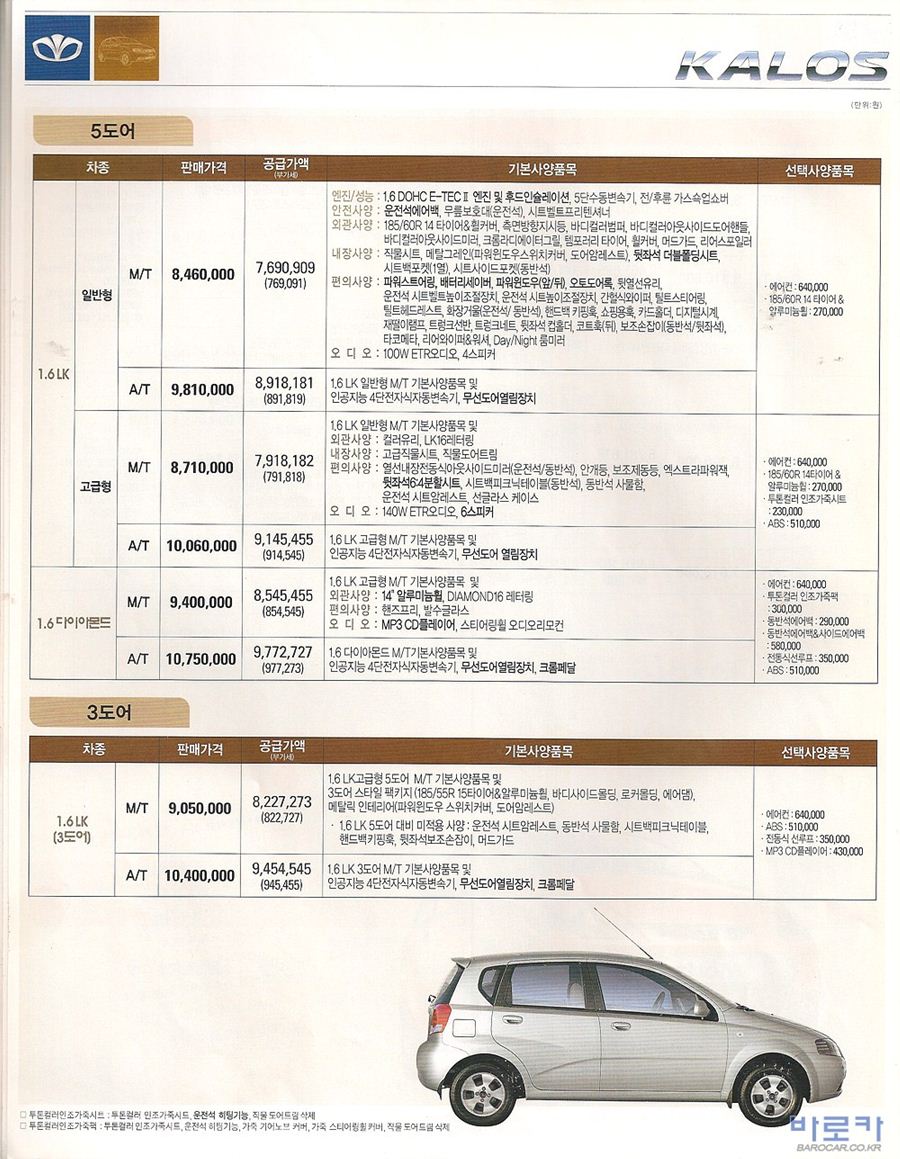 2006년 8월 칼로스 신차가격표 (2007년형)