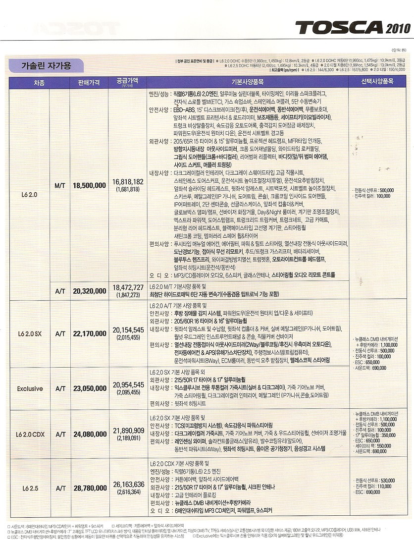 2010년 7월 토스카 신차가격표