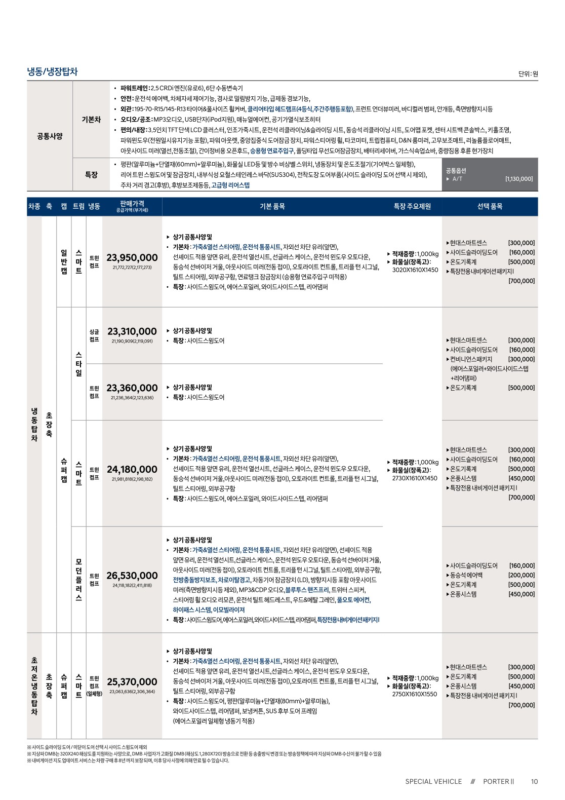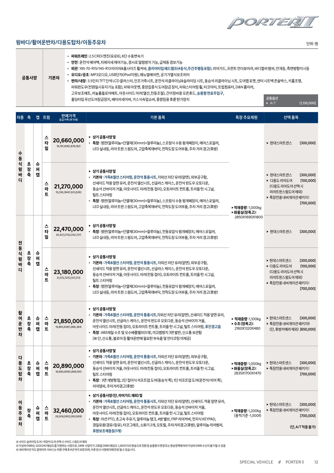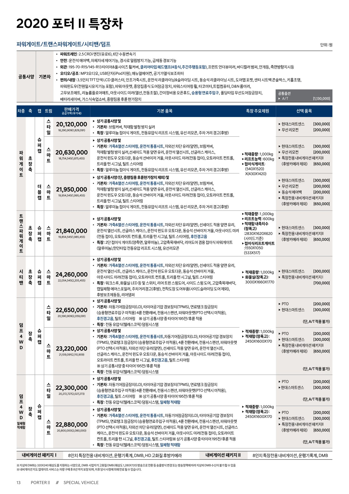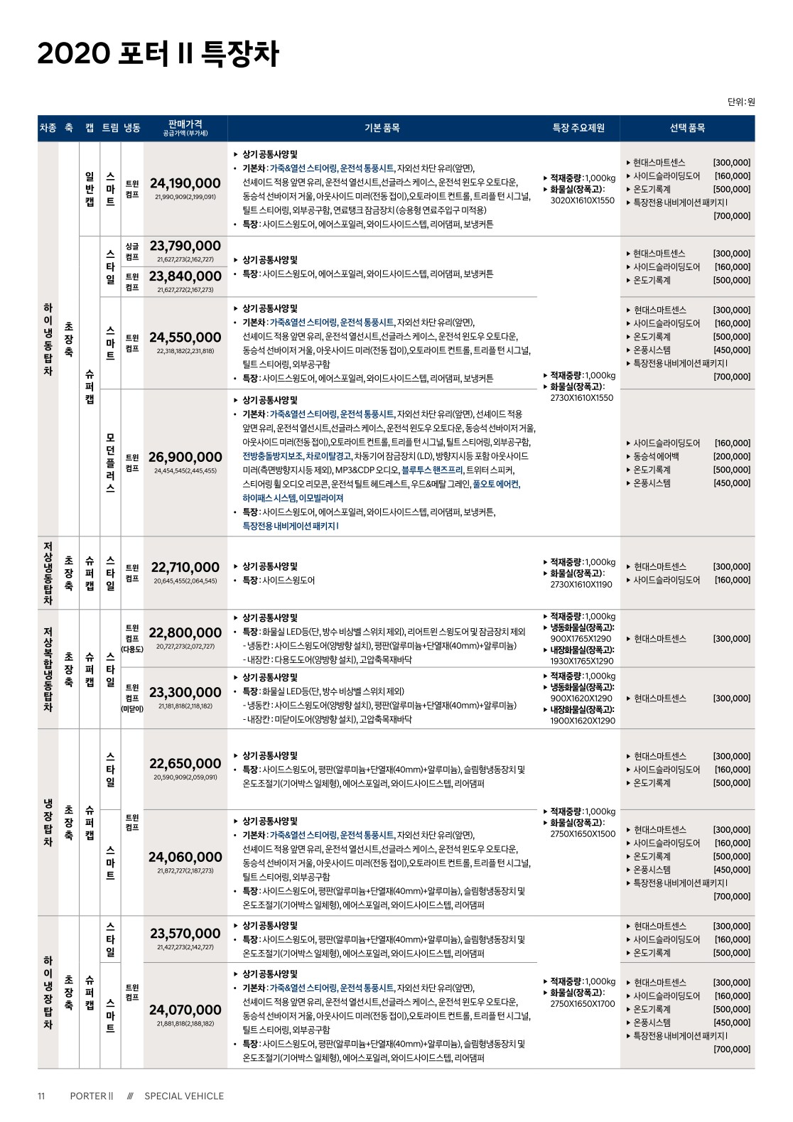 2020년 2월 포터 특장차 (내장탑차,냉장탑차,냉동탑차,파워게이트,윙바디,활어차,주유차,덤프,시티밴) 신차가격표