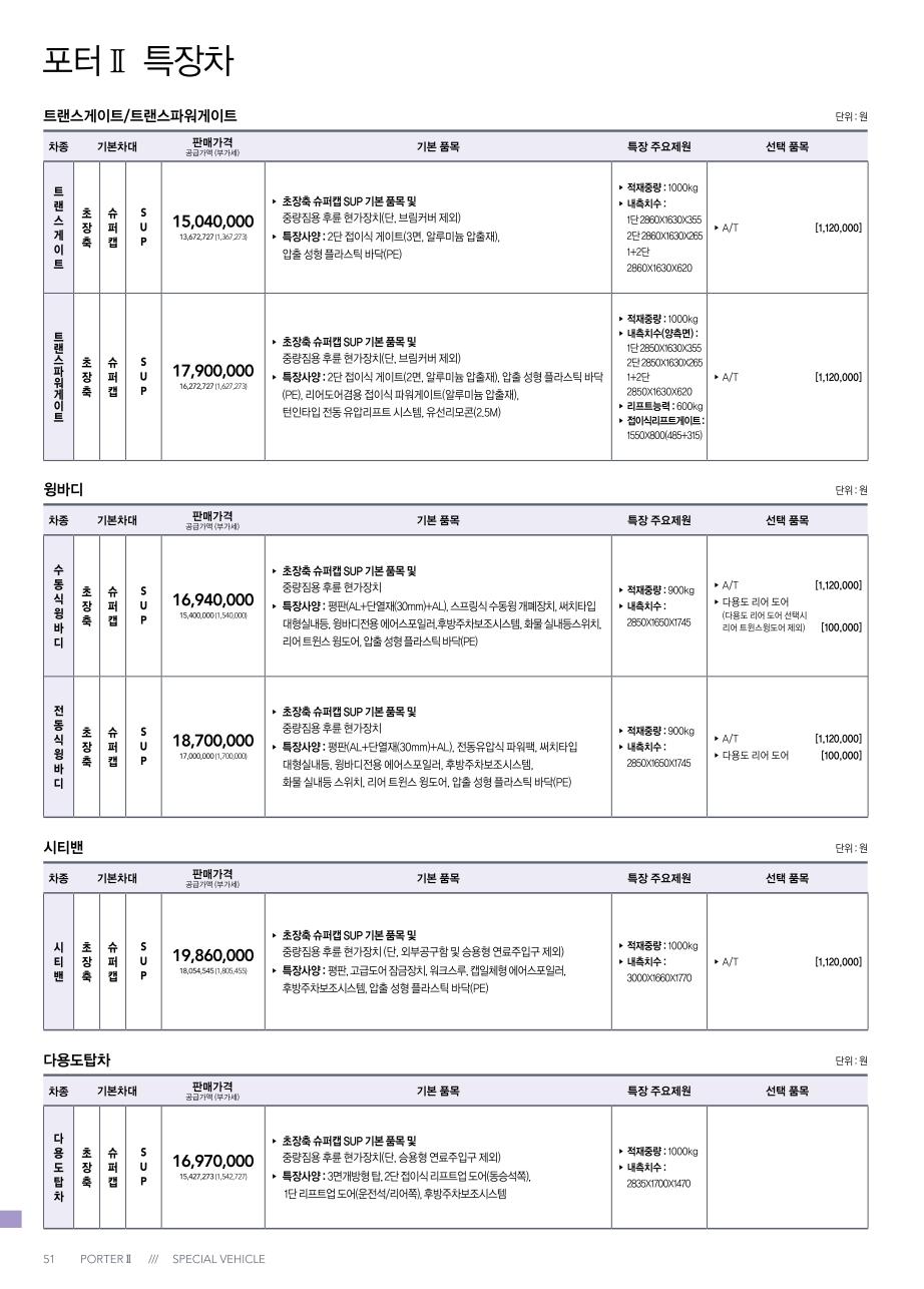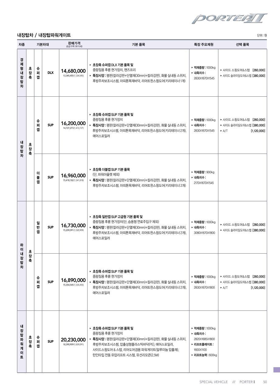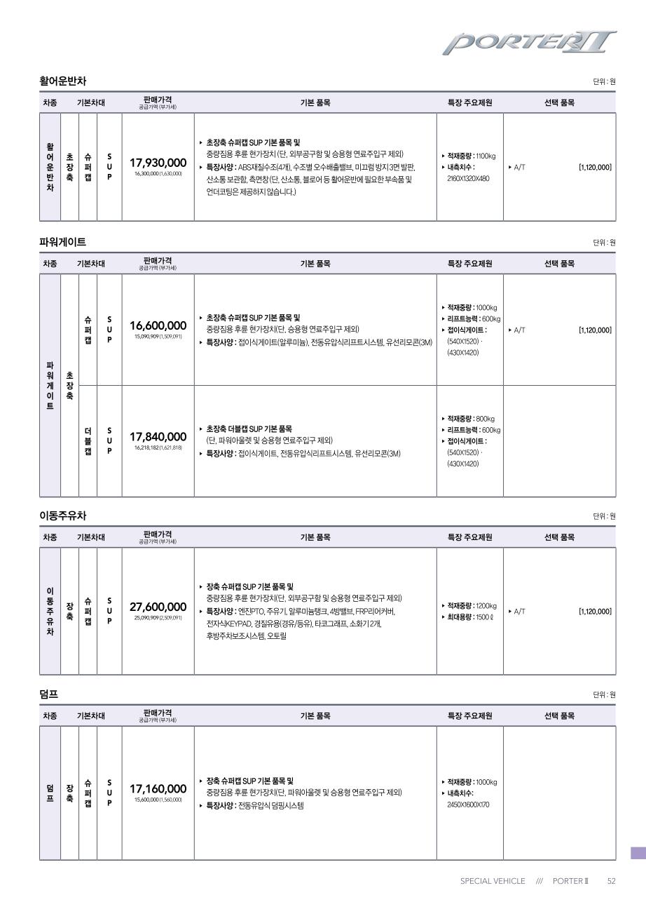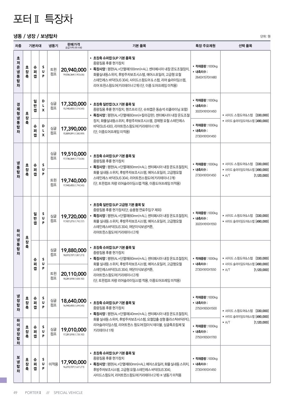 2012년 1월 포터 신차가격표 (유로V A-2 엔진 탑재)