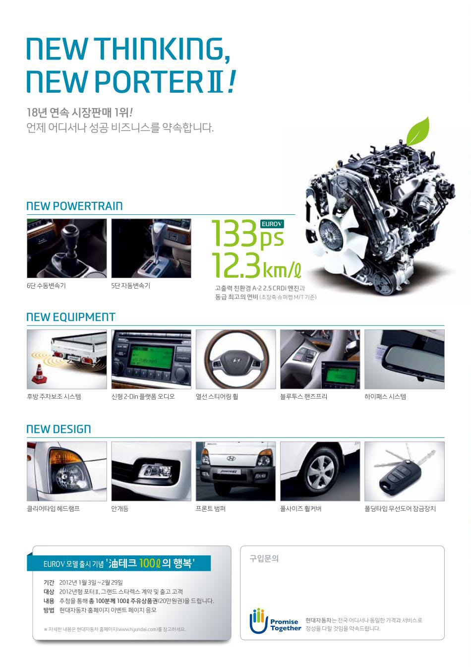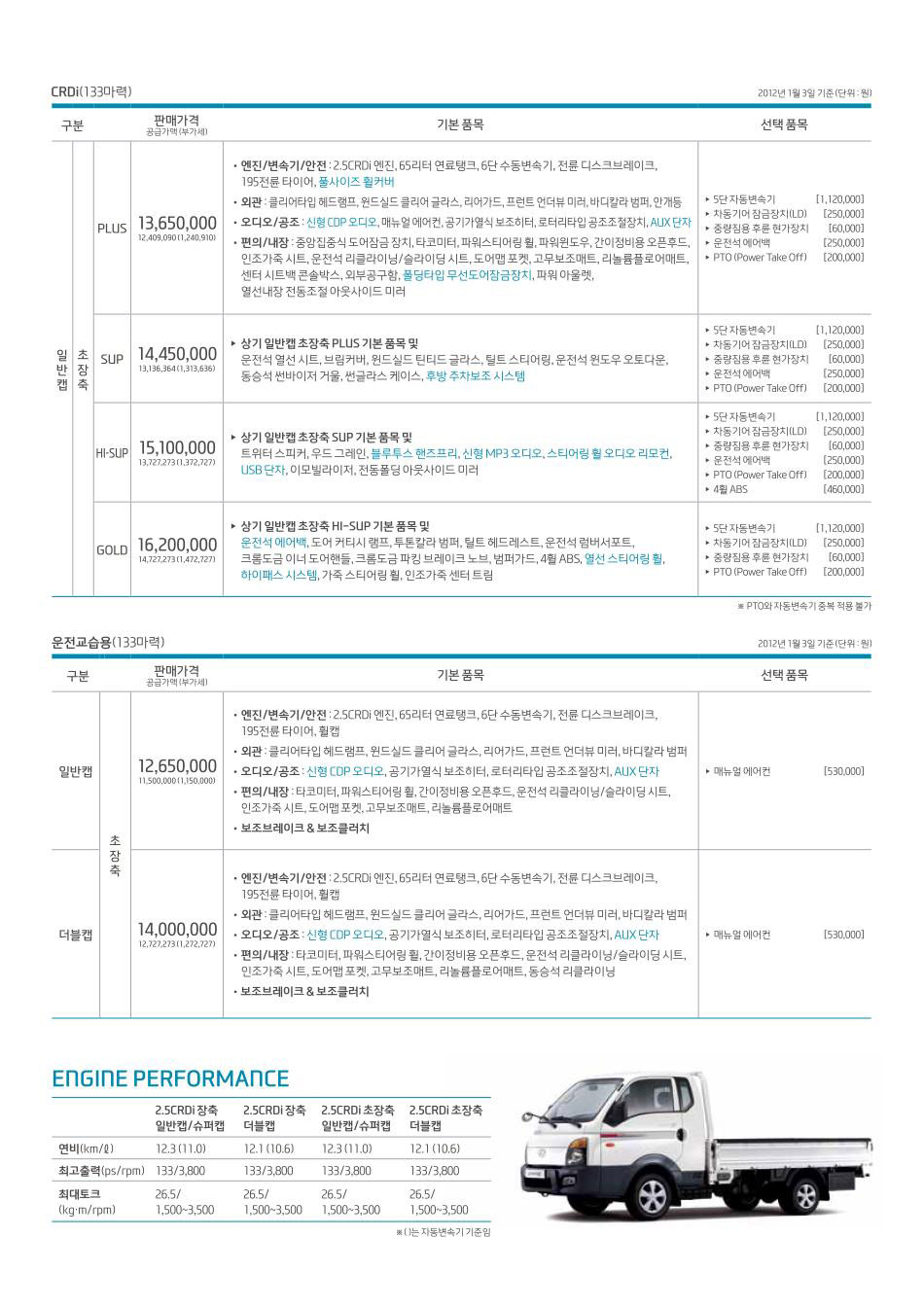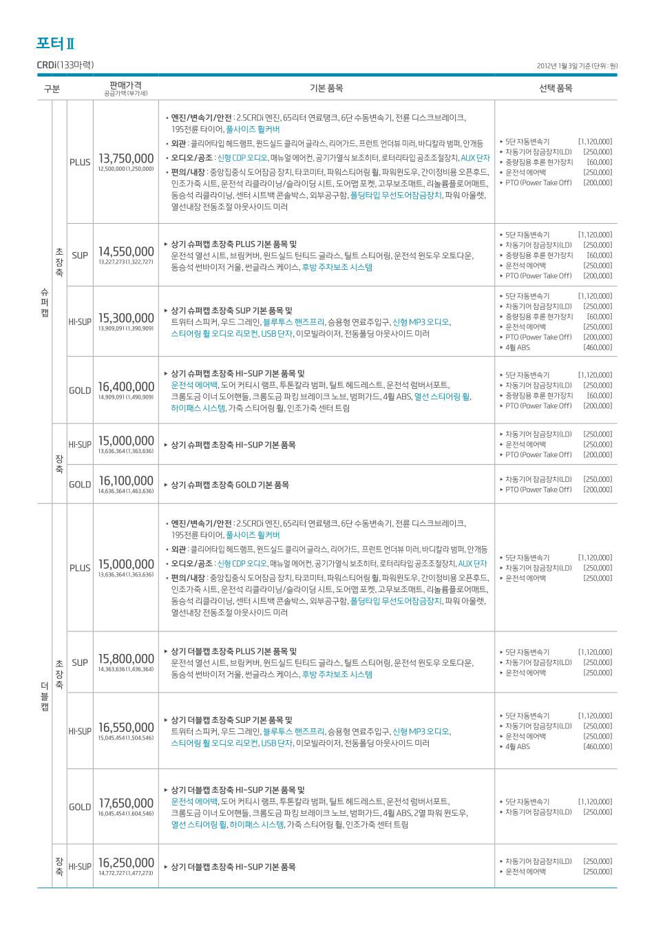 2012년 1월 포터 신차가격표 (유로V A-2 엔진 탑재)