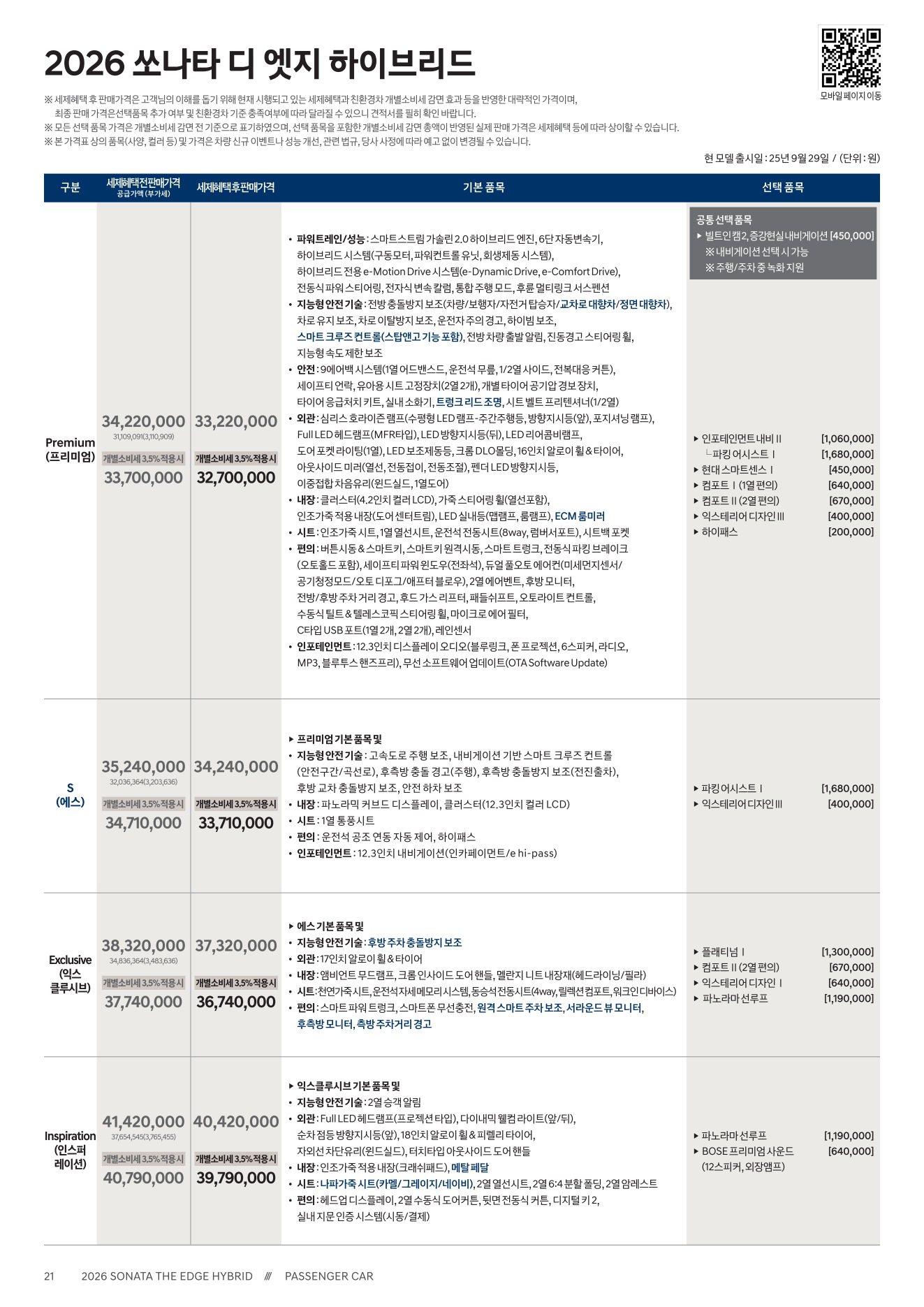 2025년 12월 쏘나타 하이브리드 신차가격표