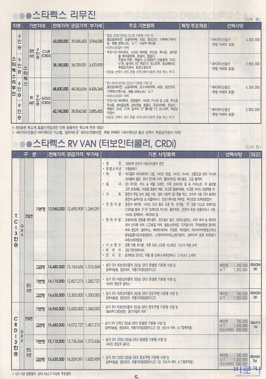 2005년 5월 스타렉스 신차가격표 (RV/점보/밴/리무진)