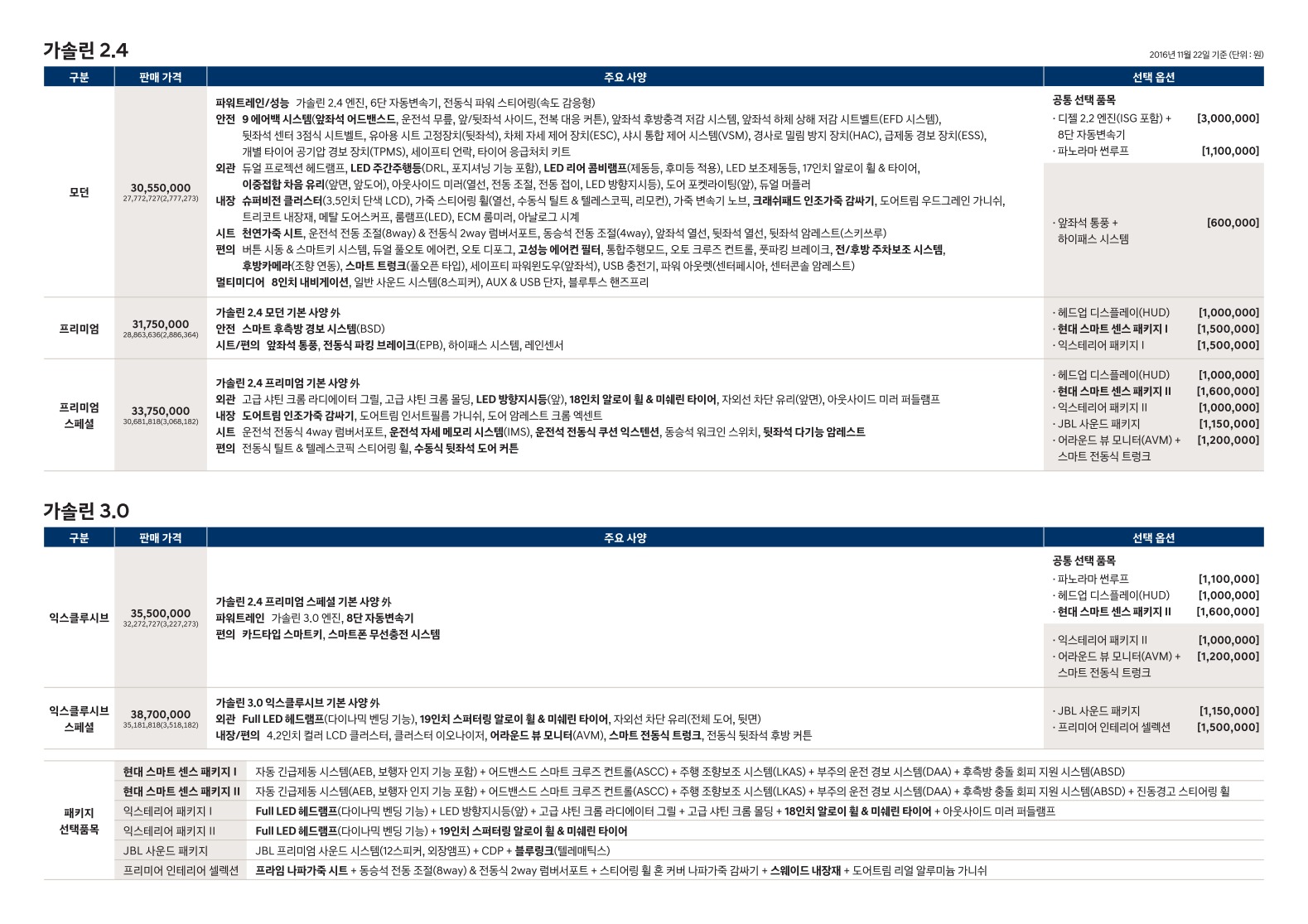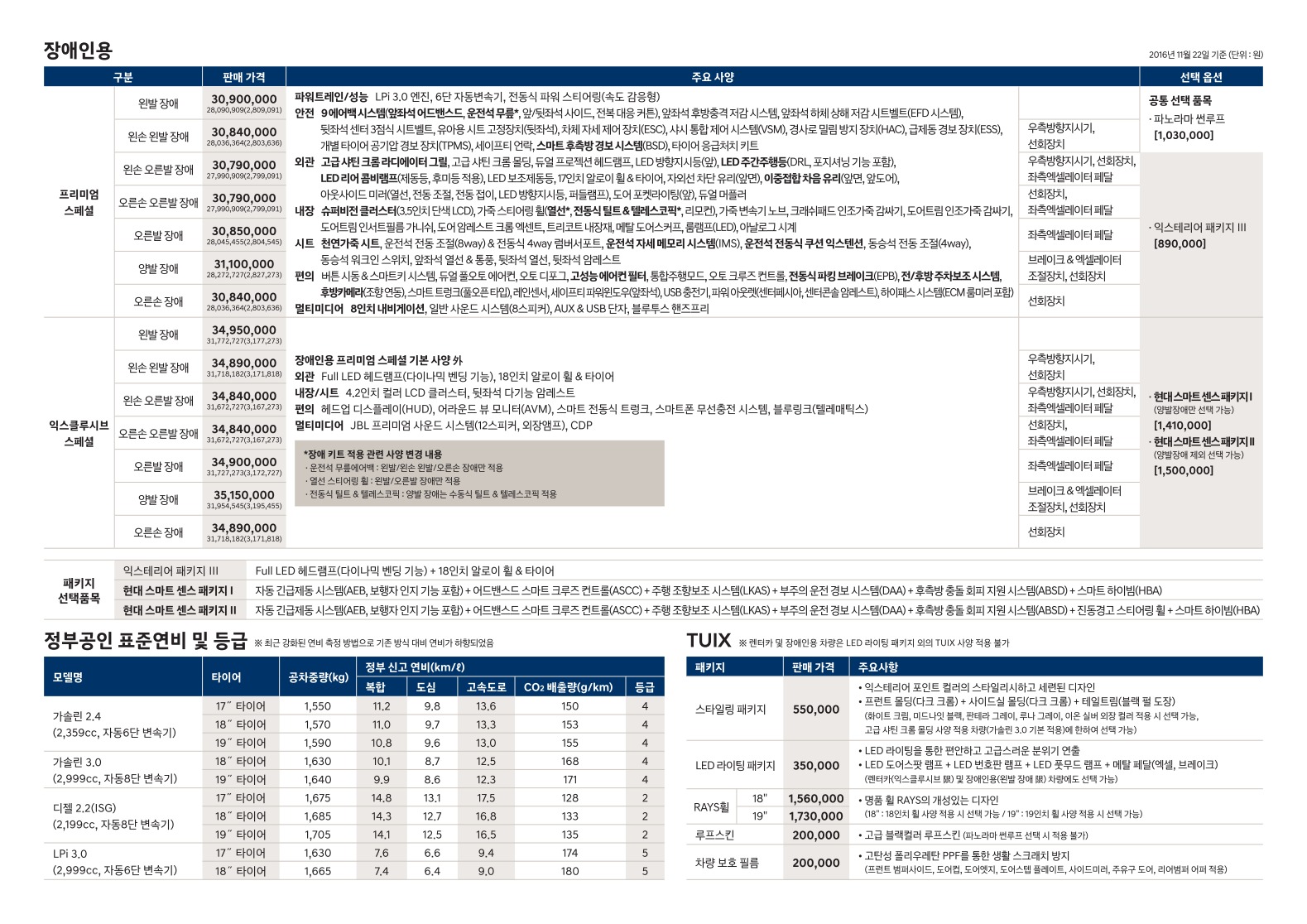 2016년 11월 그랜저 신차가격표 (그랜저IG 신차가격표)