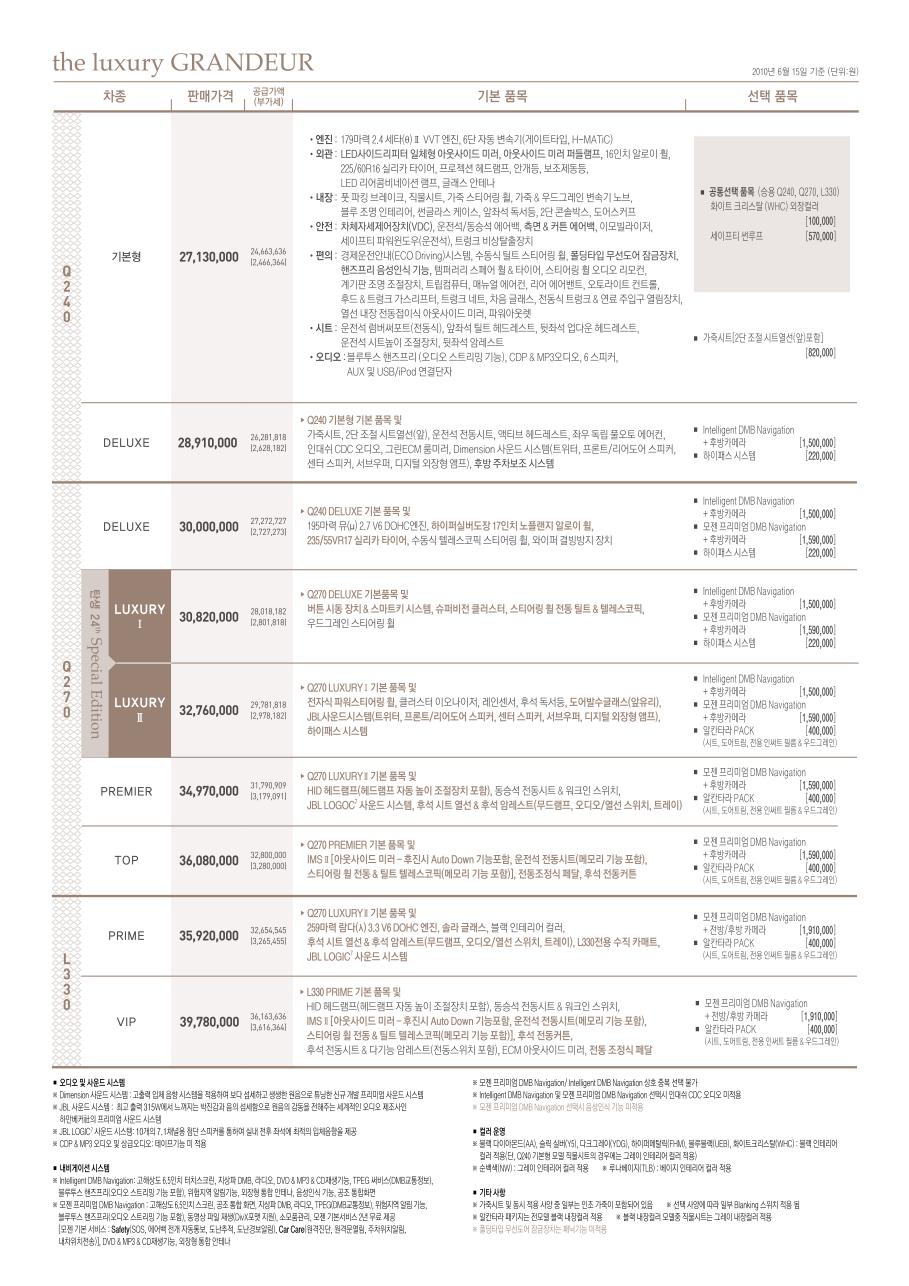 2010년 6월 그랜져TG (더럭셔리 그랜져) 신차가격표