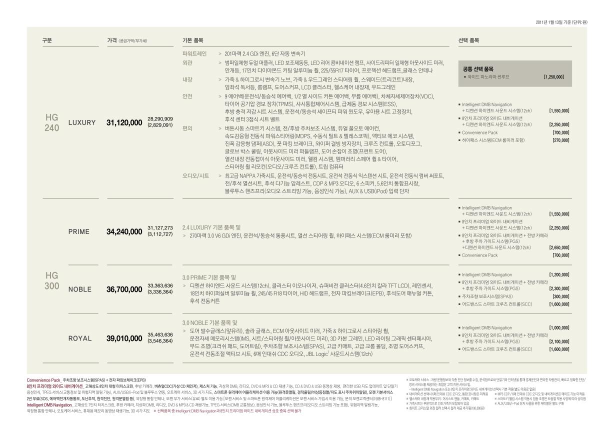 2011년 1월 그랜져HG 신차가격표