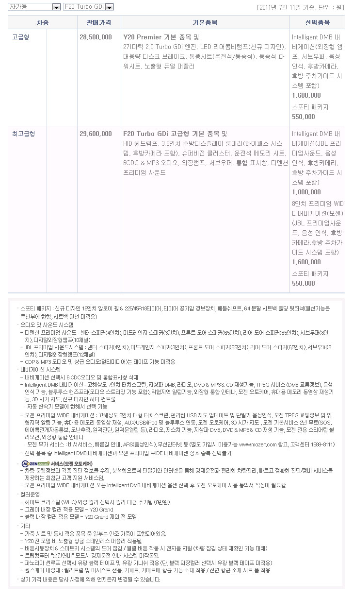 2011년 7월 YF쏘나타 터보GDi 신차가격표