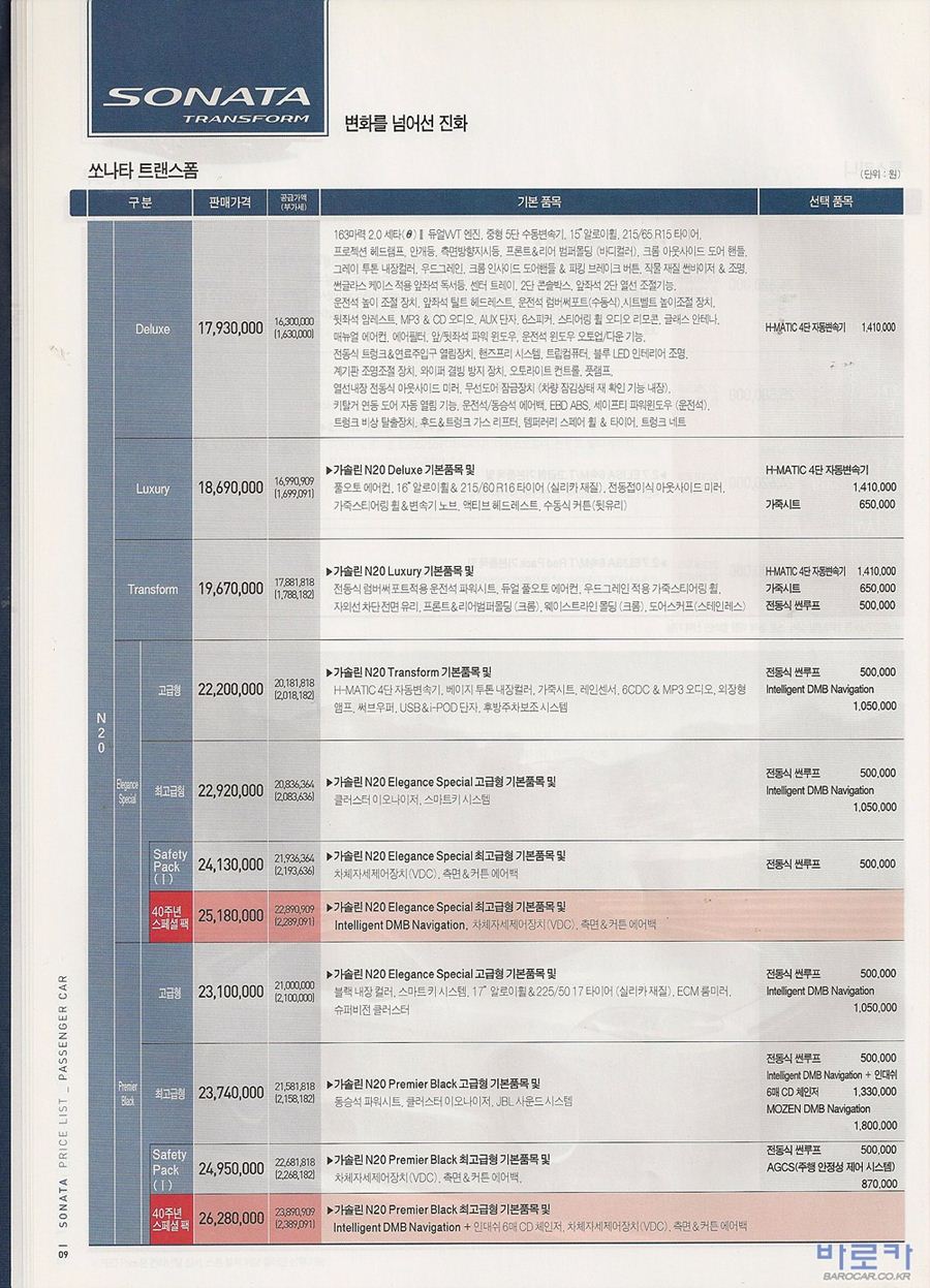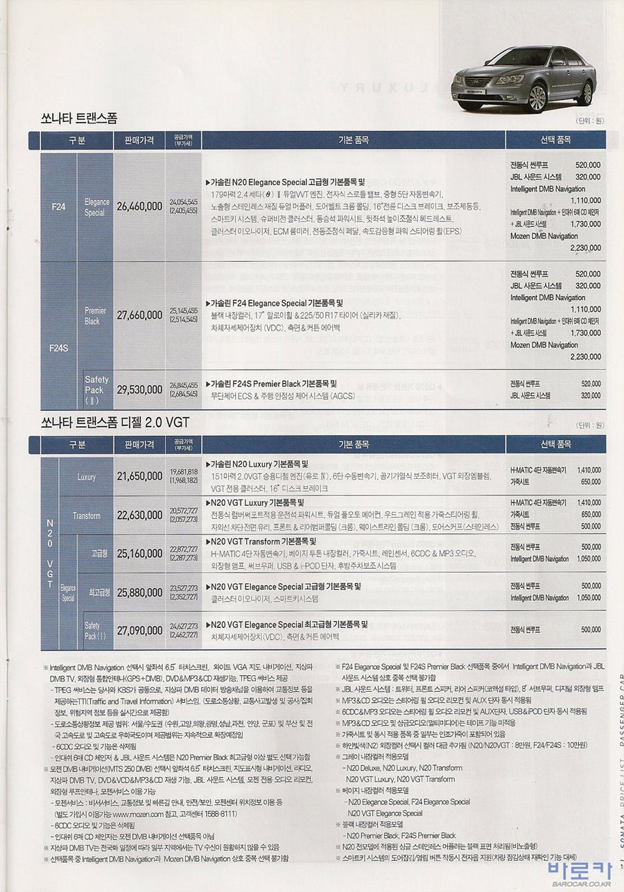 2008년 7월 NF쏘나타 트랜스폼 신차가격표 (LPG포함)