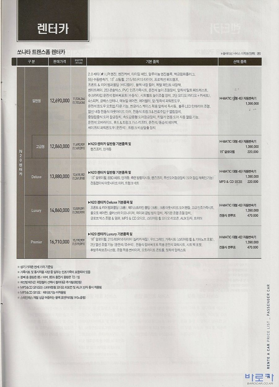 2008년 1월 NF쏘나타 트랜스폼 신차가격표 (LPG 포함)