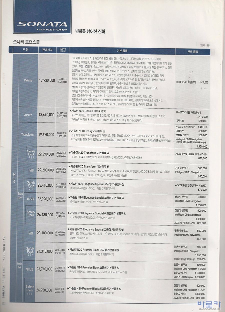 2008년 1월 NF쏘나타 트랜스폼 신차가격표 (LPG 포함)