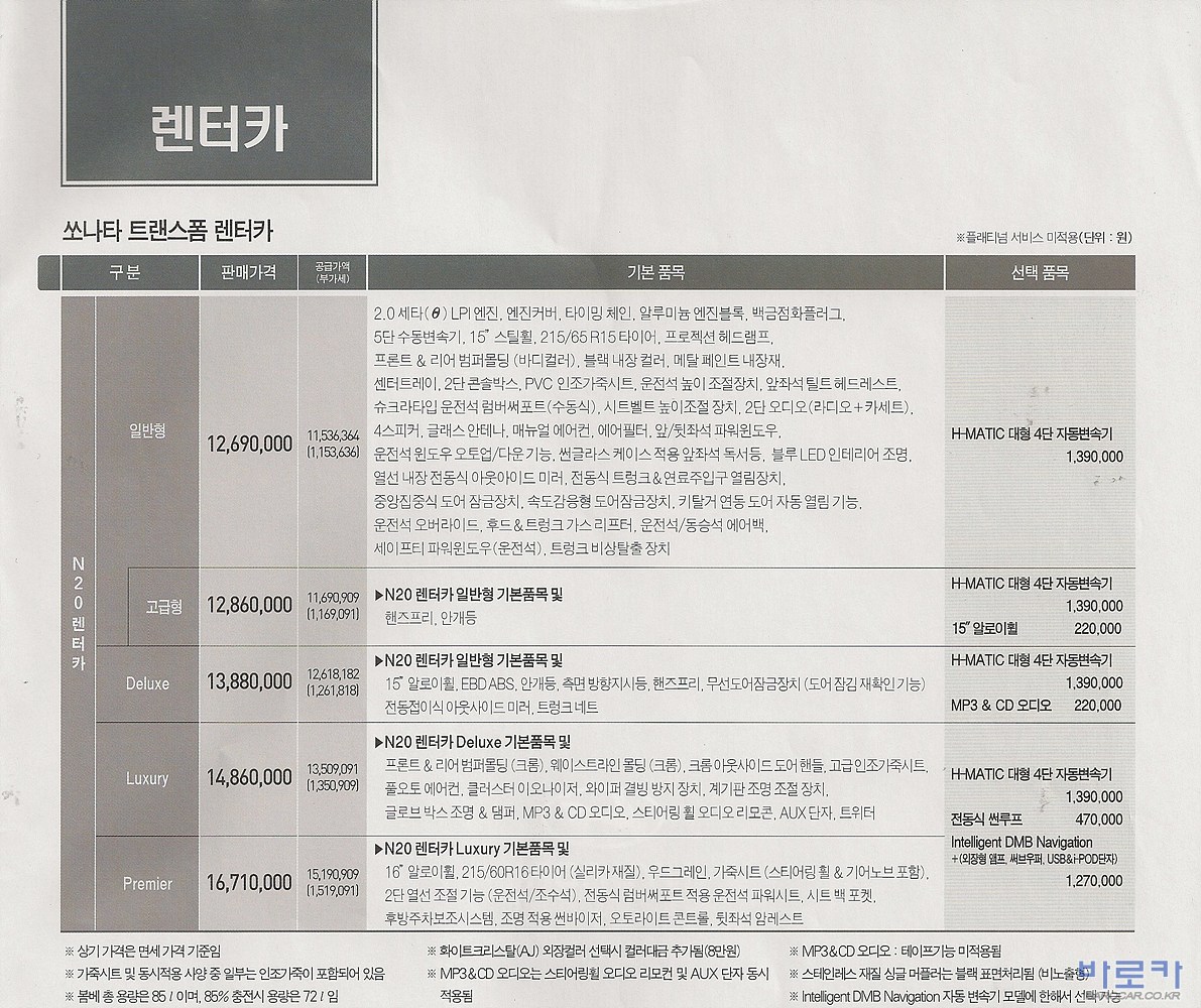 2009년 3월 NF쏘나타 트랜스폼 신차가격표 (LPG포함)