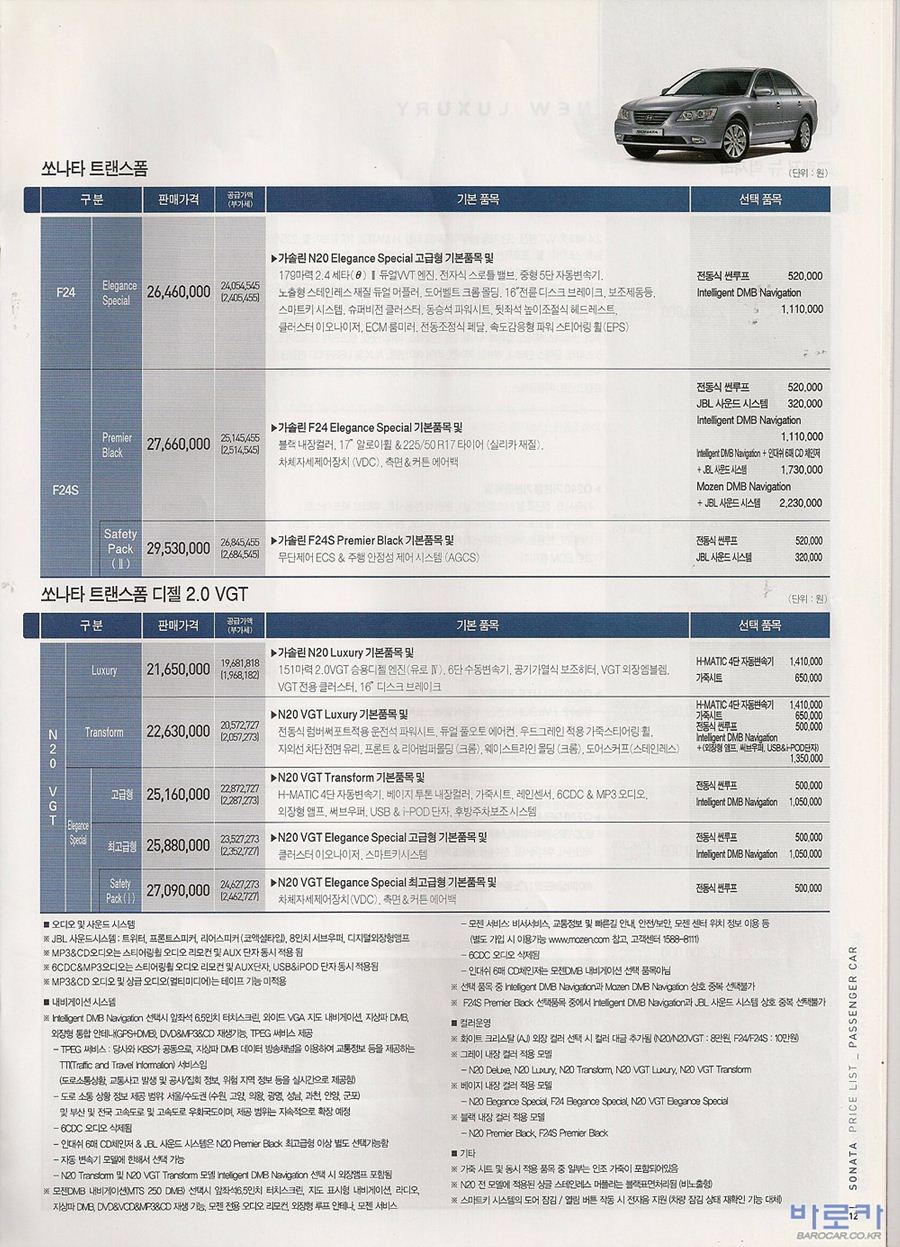 2008년 7월 NF쏘나타 트랜스폼 신차가격표 (LPG포함)