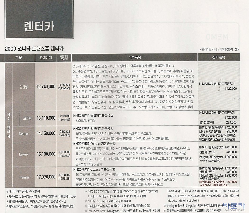 2009년 3월 NF쏘나타 트랜스폼 신차가격표 (LPG포함)