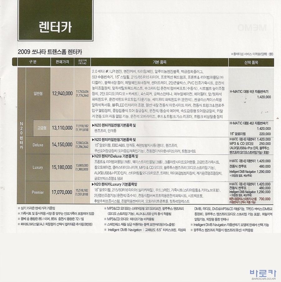 2009년 3월 NF쏘나타 트랜스폼 신차가격표 (LPG포함)