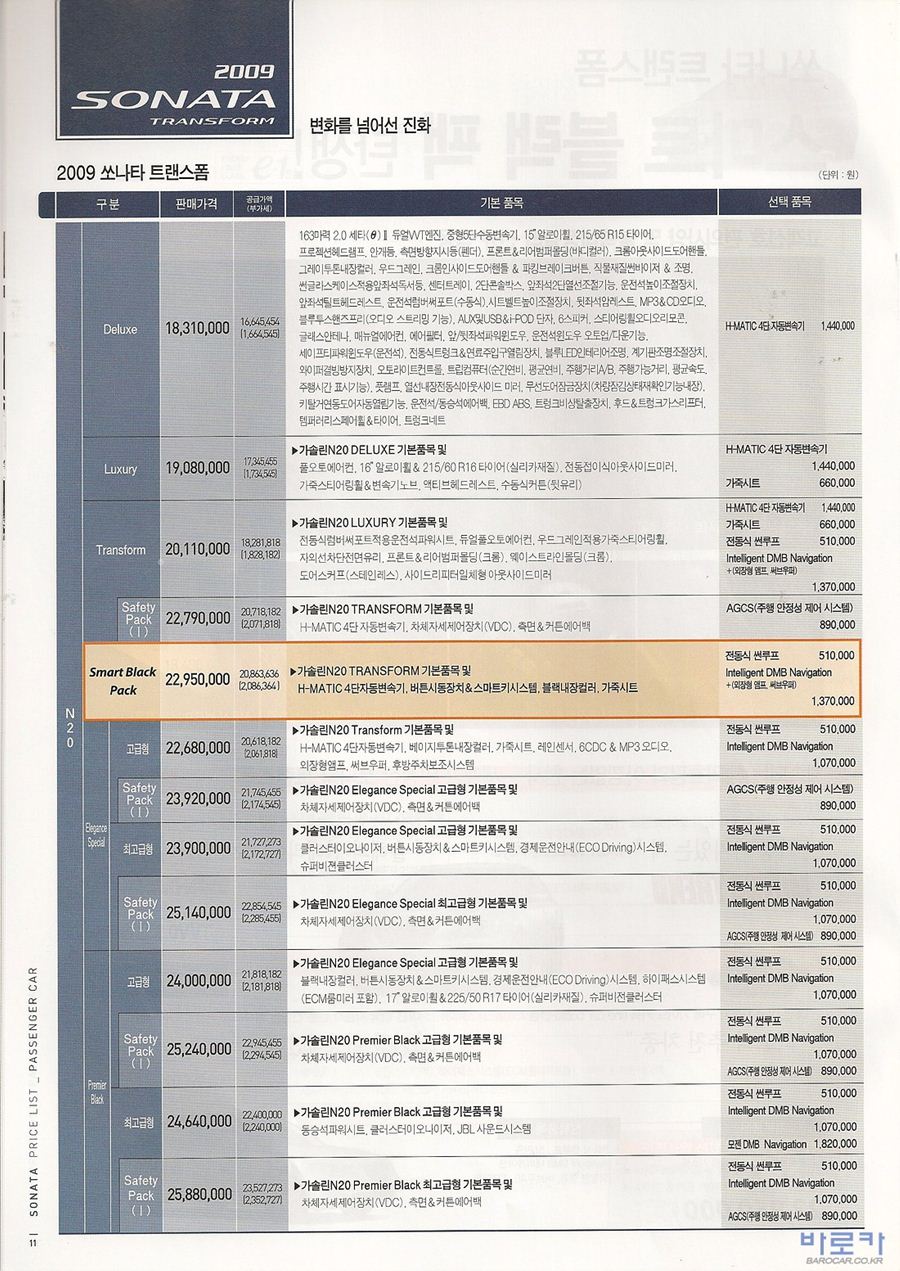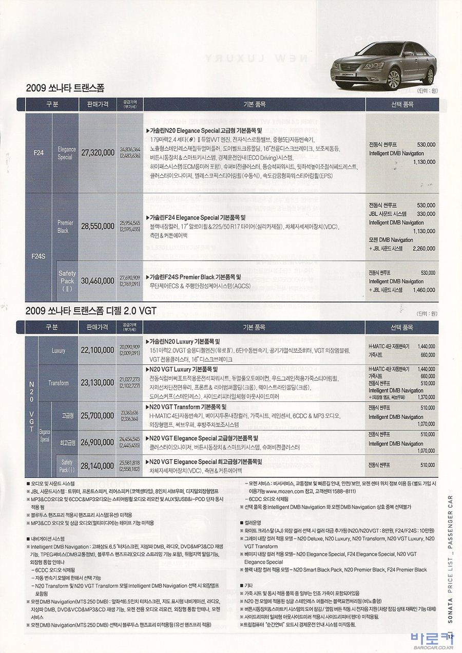 2009년 11월 YF쏘나타 신차가격표