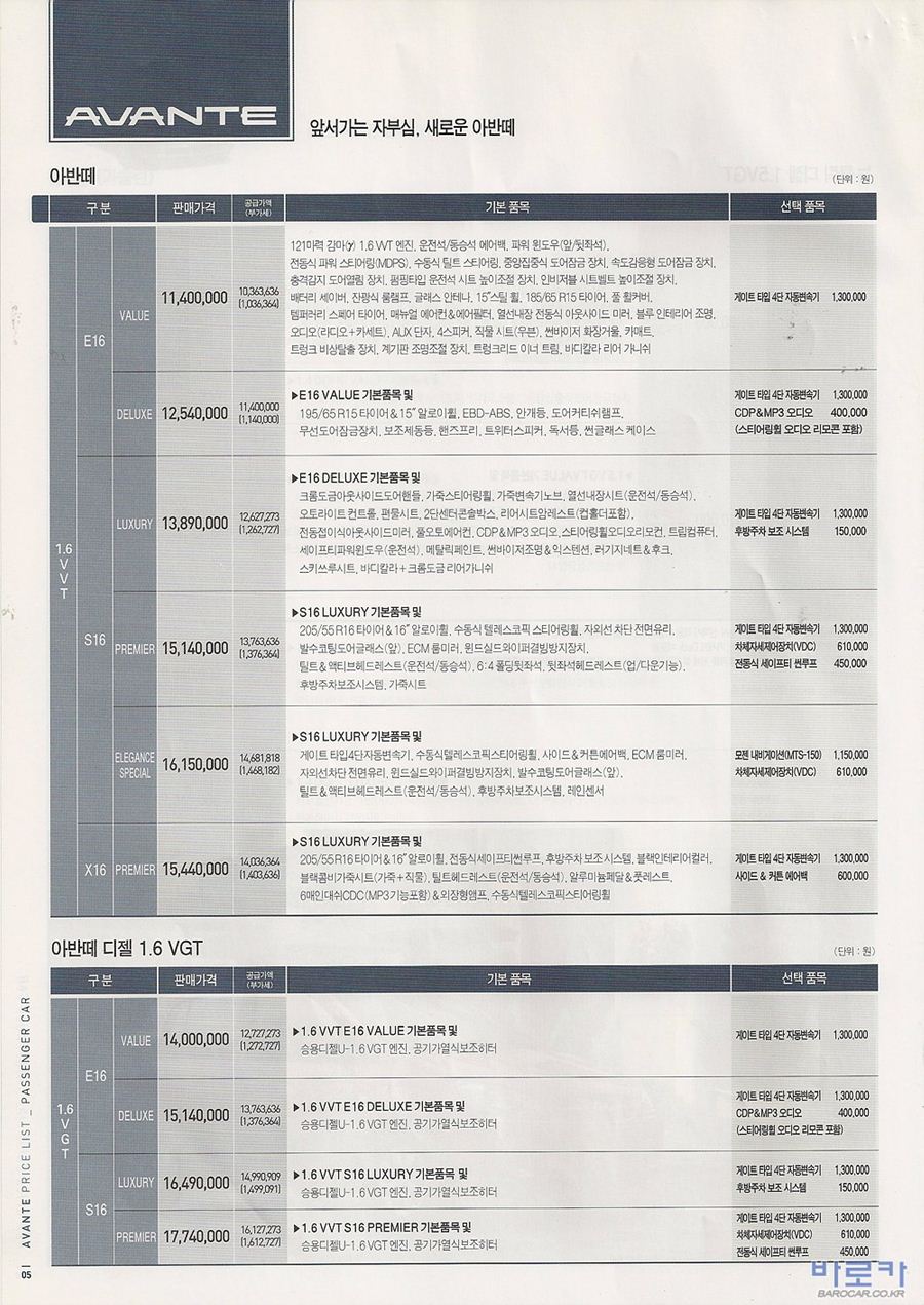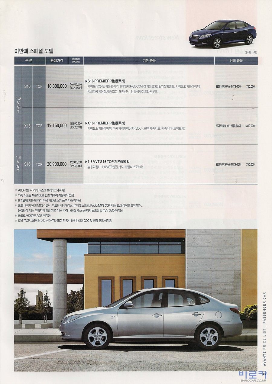2009년 3월 아반떼HD 신차가격표