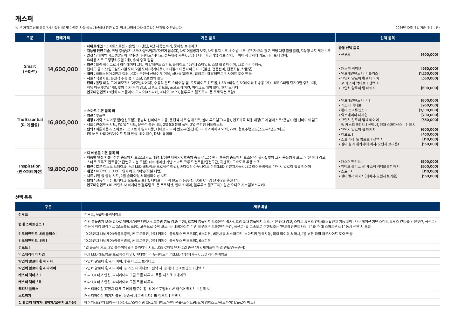 2024년 10월 캐스퍼 신차가격표 (더 뉴 캐스퍼 출시)