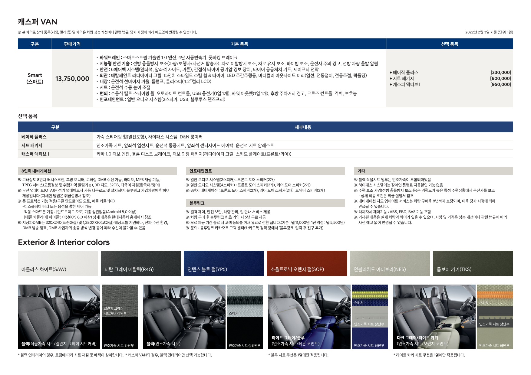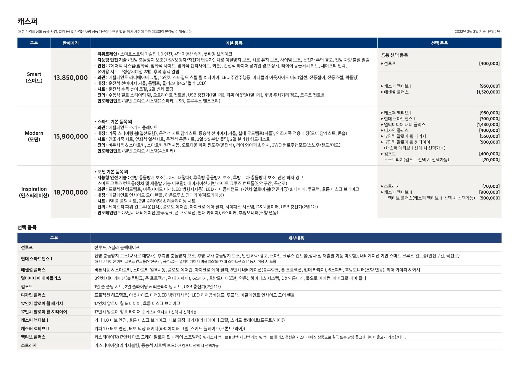 2022년 2월 캐스퍼 신차가격표 (캐스퍼 밴 출시)
