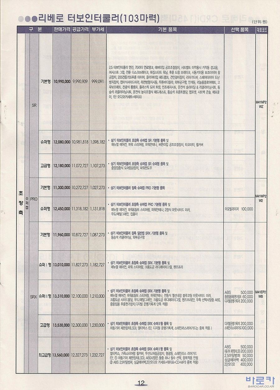 2006년 12월 리베로 신차가격표 (CRDi/터보인터쿨러)