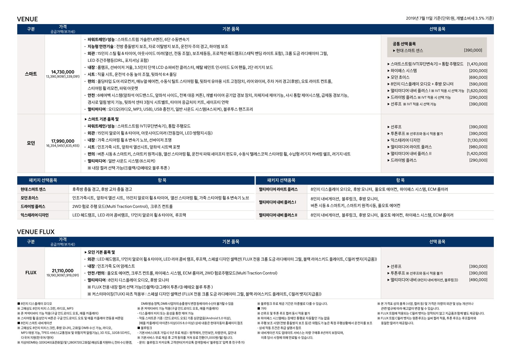 2019년 7월 베뉴 가격표 . (현대 베뉴 출시)