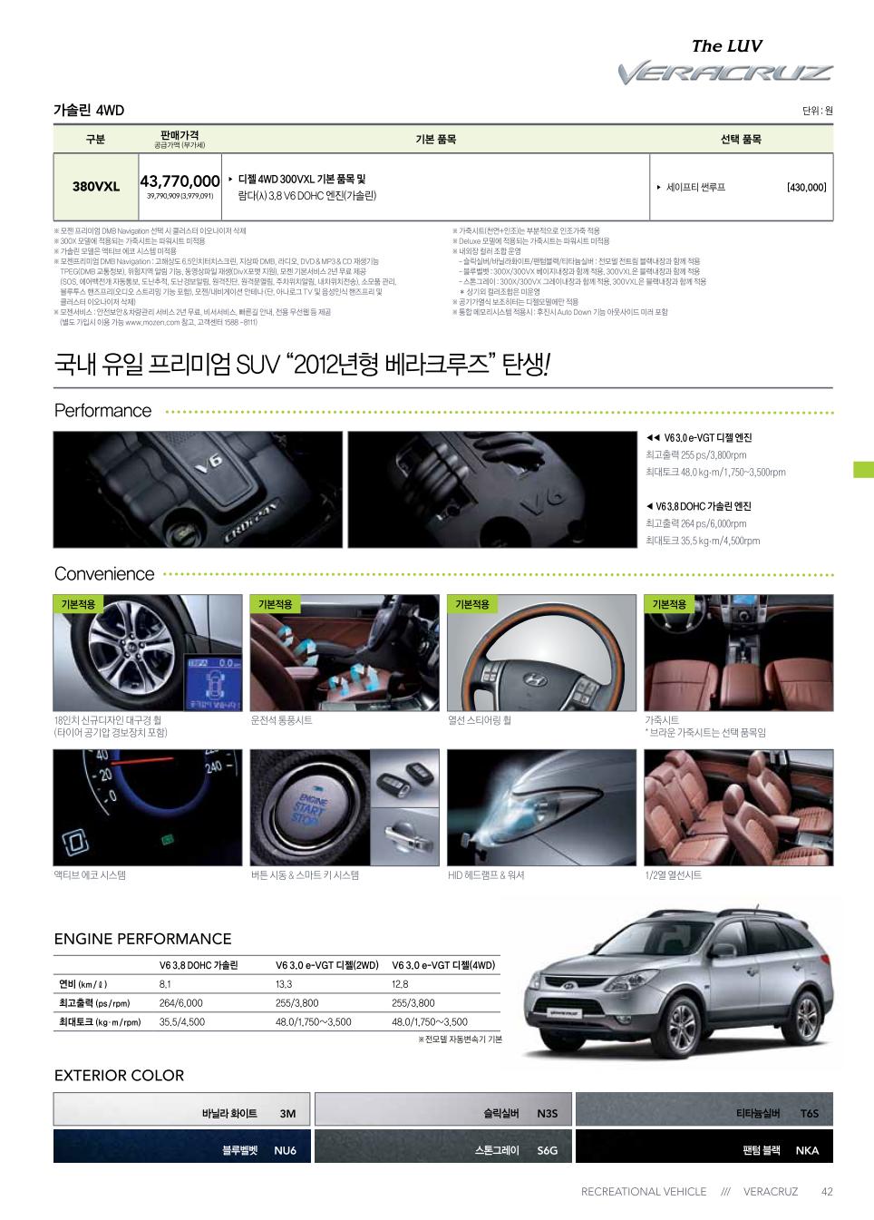 2012년 3월 베라크루즈 신차 가격표 (한미 FTA 개별소비세인하 반영)