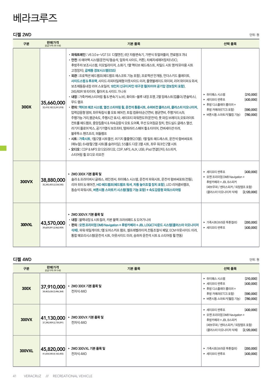 2013년 1월 베라크루즈 신차가격표
