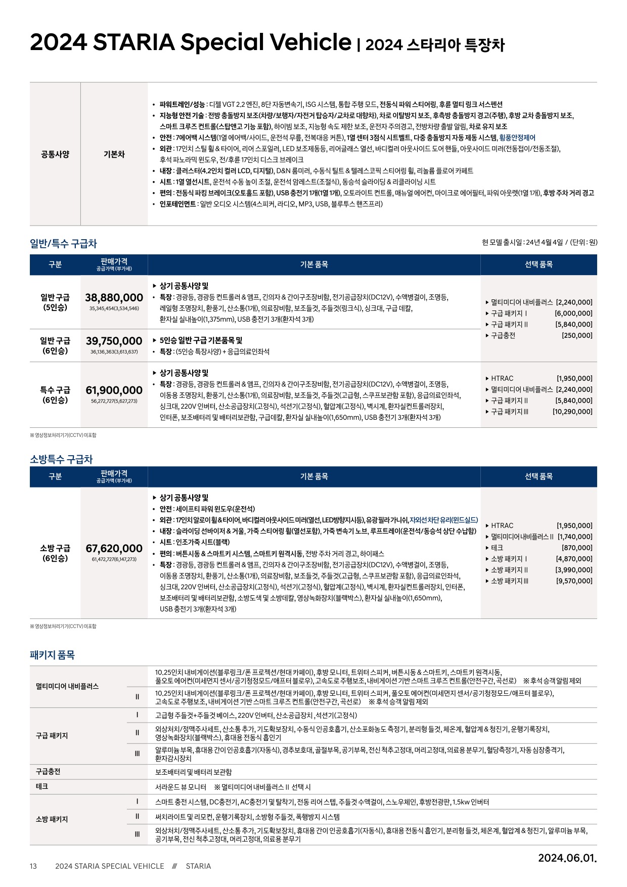 2024년 6월 스타리아 투어러 & 카고 & 특장차 신차가격표