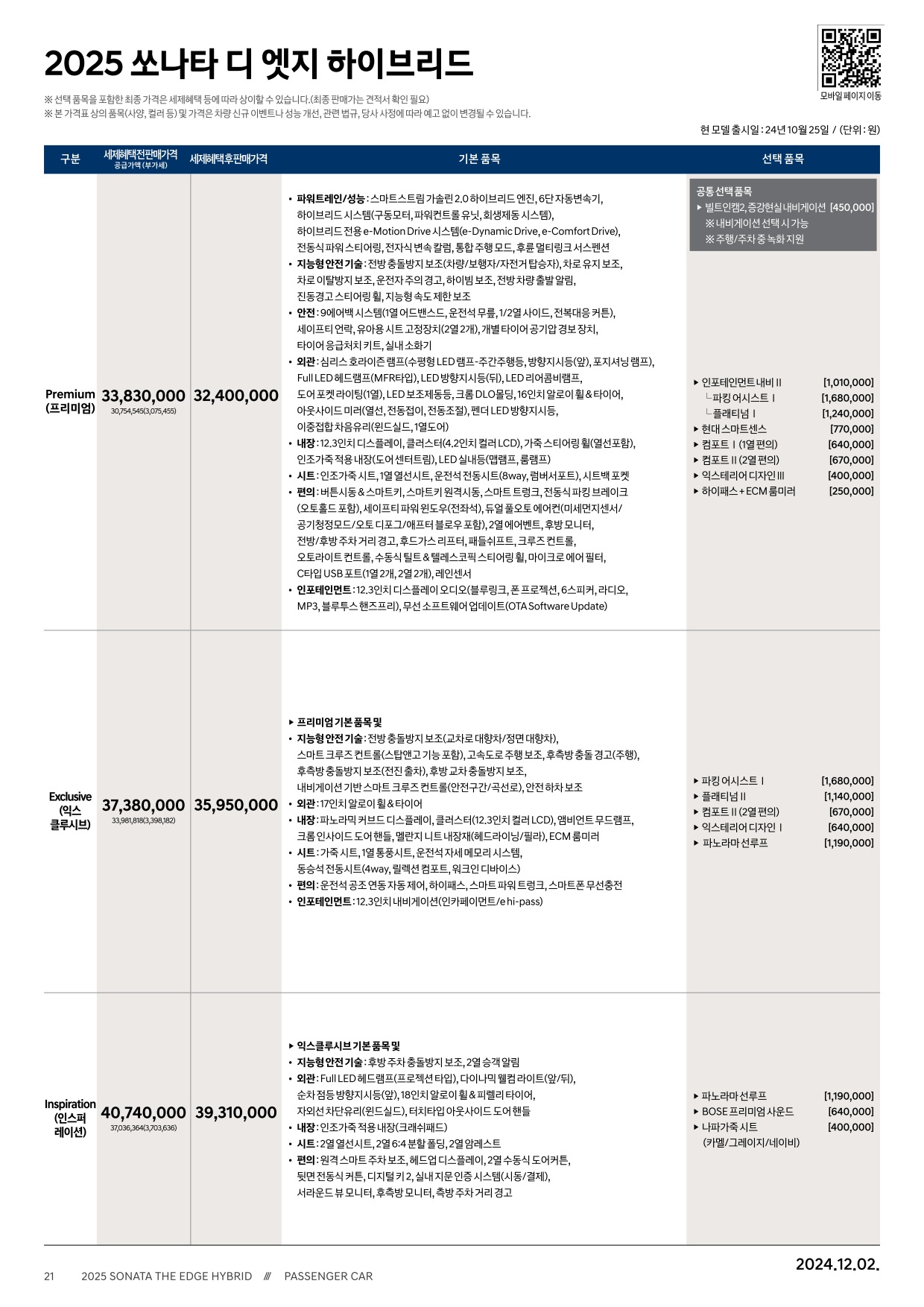 2024년 12월 쏘나타 하이브리드 신차가격표