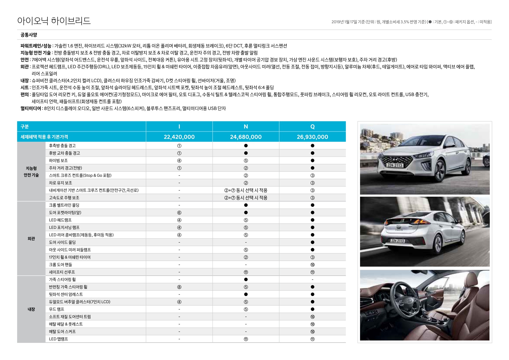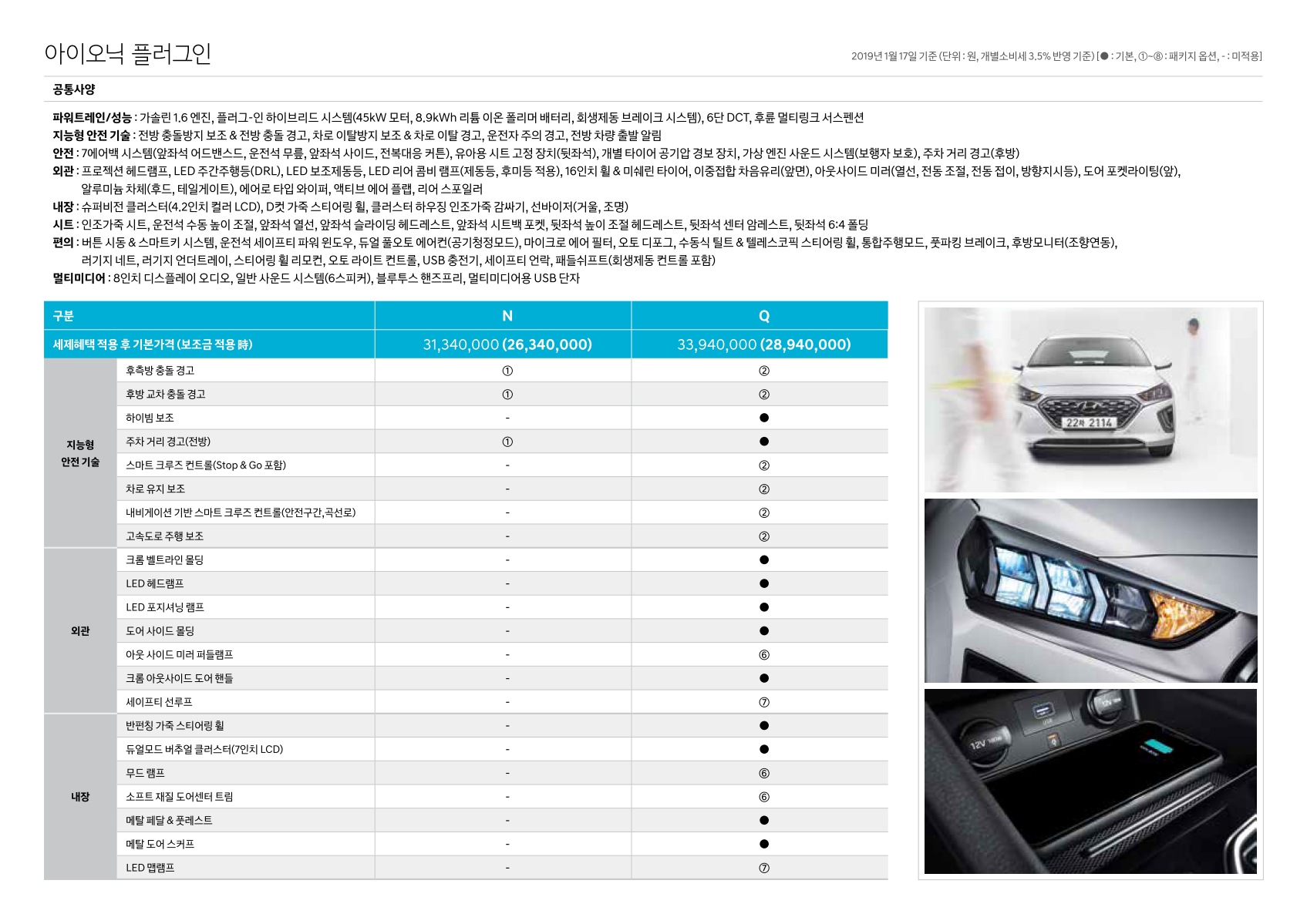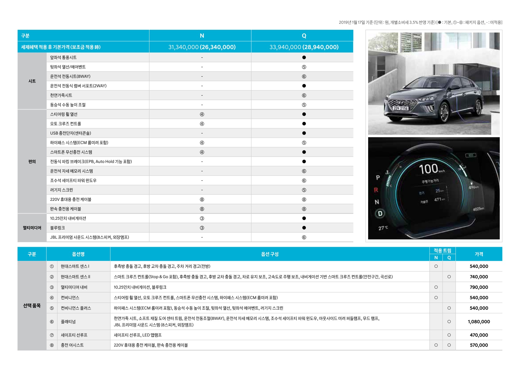 2019년 1월 아이오닉 & 아이오닉 플러그인 신차가격표