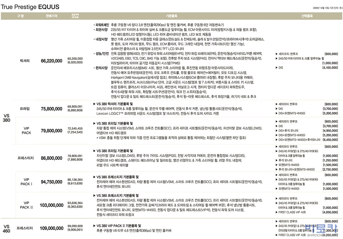 2009년 10월 뉴에쿠스 신차가격표