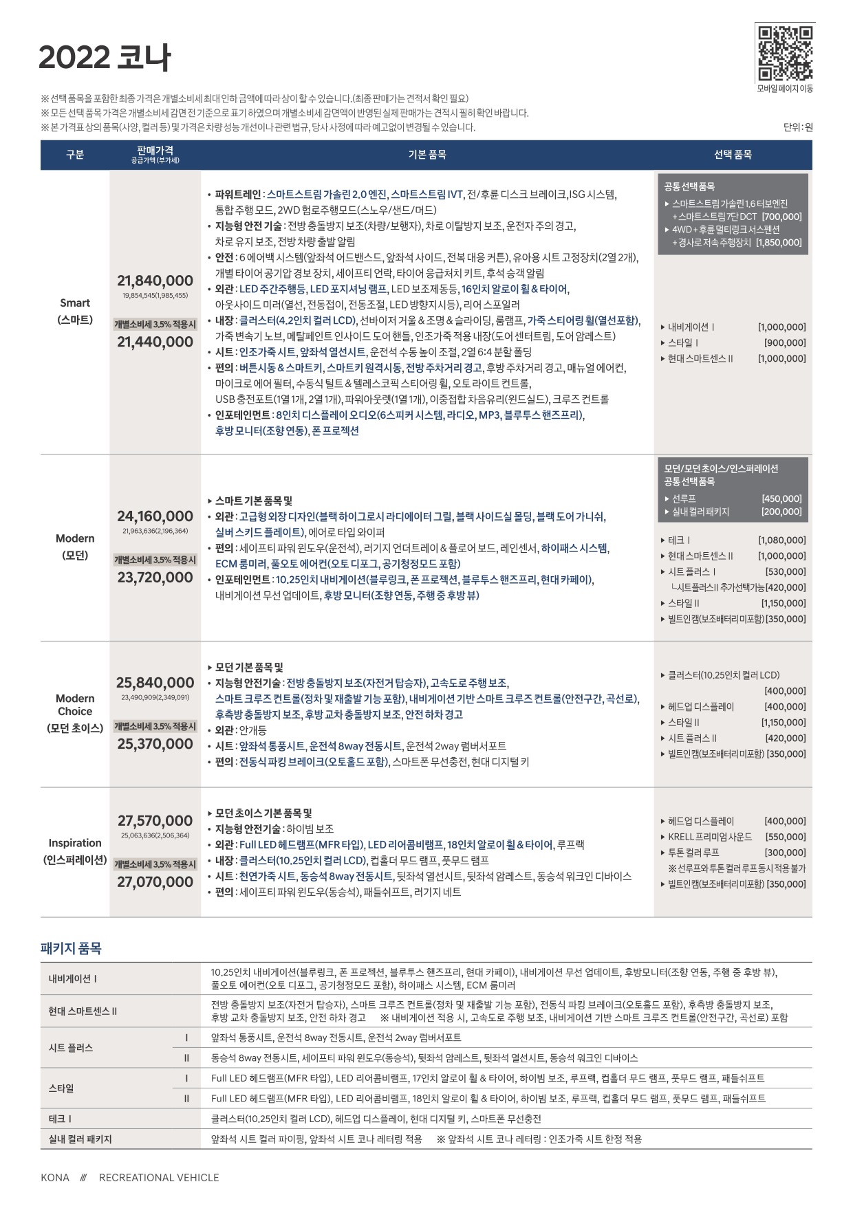 2022년 4월 코나 신차가격표 (2022년형 코나, 코나하이브리드, 코나N라인 출시)
