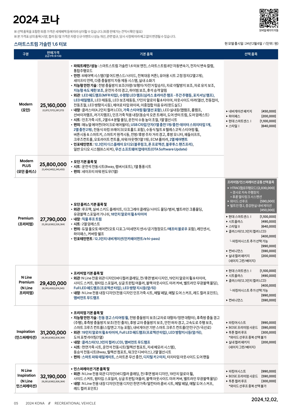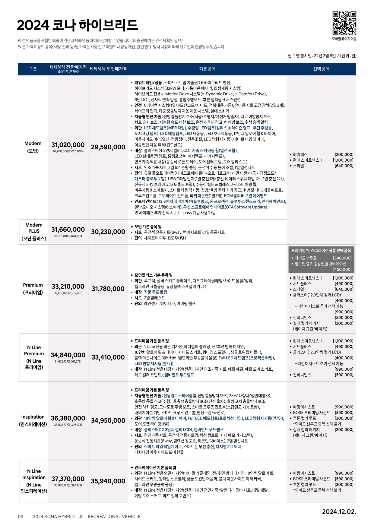 2024년 12월 코나 & 코나 하이브리드 신차가격표