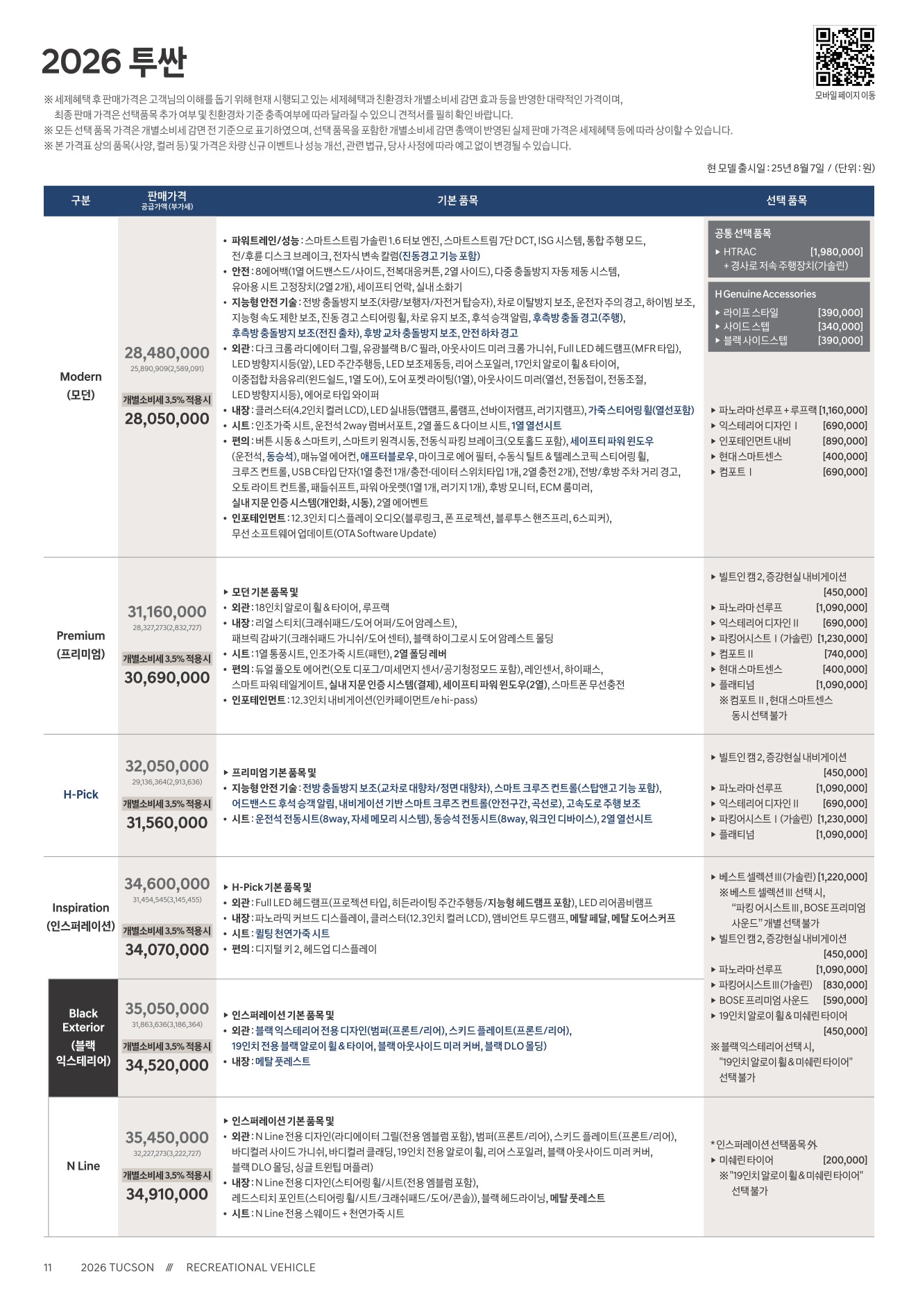 2025년 8월 투싼 하이브리드 신차가격표 (2026년형 투싼 하이브리드 출시)