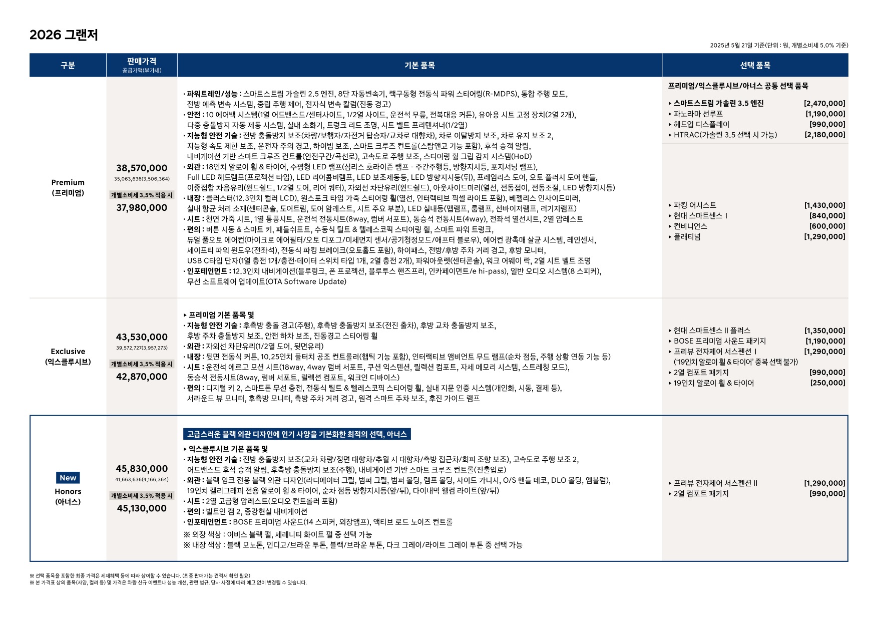2025년 5월 그랜저 하이브리드 신차가격표 (2026년형 그랜드 하이브리드 출시)